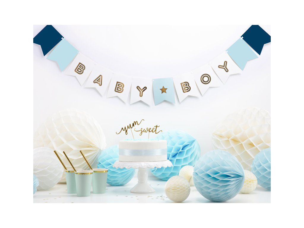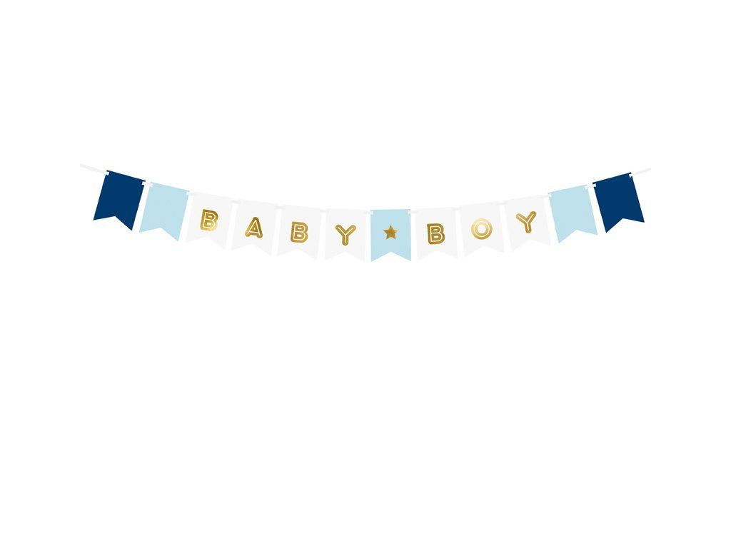 Stwórz kolorową dekorację imprezową z benerem Baby Boy. Ten baner z napisem jest świetnym dodatkiem na każdą uroczystość Baby Shower,