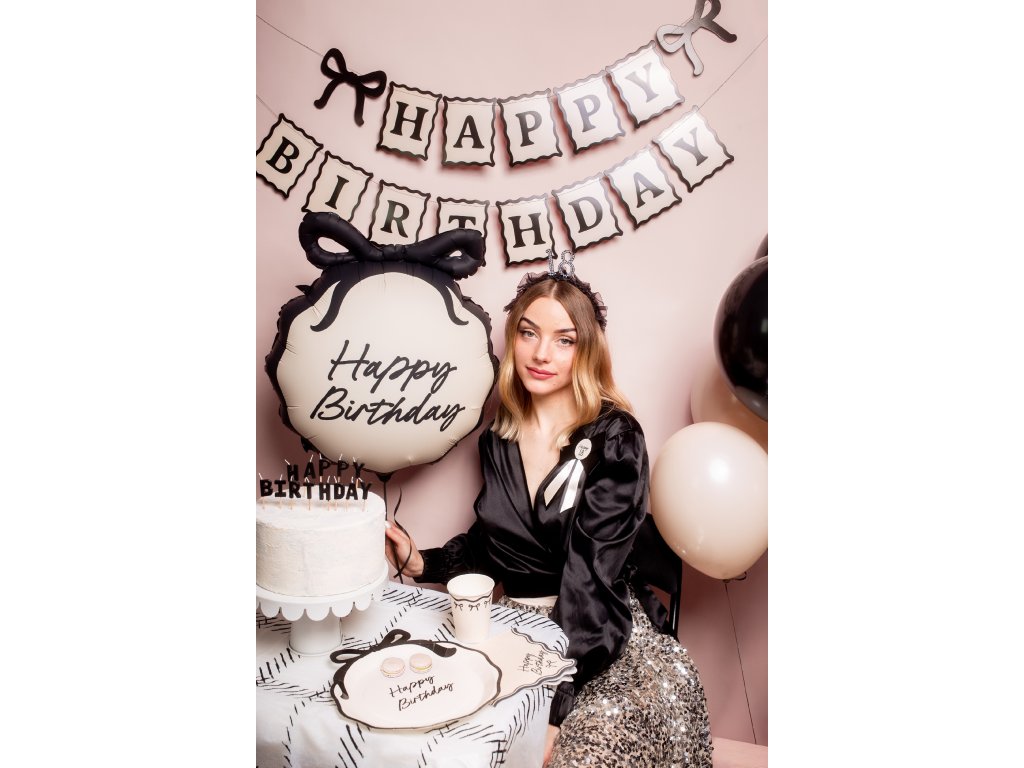 Świętuj urodziny elegancko z tym stylowym banerem Happy Birthday w połączeniu kremowego i czarnego koloru. Jest idealny do ozdobienia ścian, sufitów lub przyjęć, od razu po wyjęciu z opakowania, bez potrzeby dodatkowego montażu. Papierowy baner jest solidnie połączony czarnym sznurkiem, dzięki czemu łatwo można go powiesić i utrzymuje kształt przez całe przyjęcie. To idealna dekoracja, która doda urodzinowej imprezie elegancki i wyrafinowany charakter.