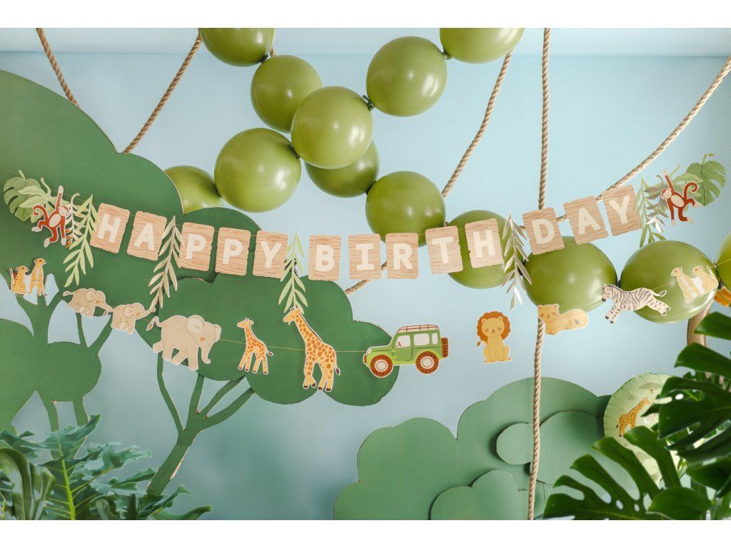 Stylowa i zabawna dekoracja, która stworzy doskonałą urodzinową atmosferę. Zestaw zawiera beżowy baner z napisem „Happy Birthday” uzupełniony motywami liści i małp (długość 180 cm) oraz girlandę z motywem safari (długość 180 cm). Obie części są połączone złotym sznurkiem o łącznej długości około 280 cm. Baner jest gotowy do natychmiastowego użycia prosto z opakowania, a dzięki oryginalnemu wzornictwu jest idealny na dziecięce imprezy, tematyczne przyjęcia czy spotkania rodzinne.