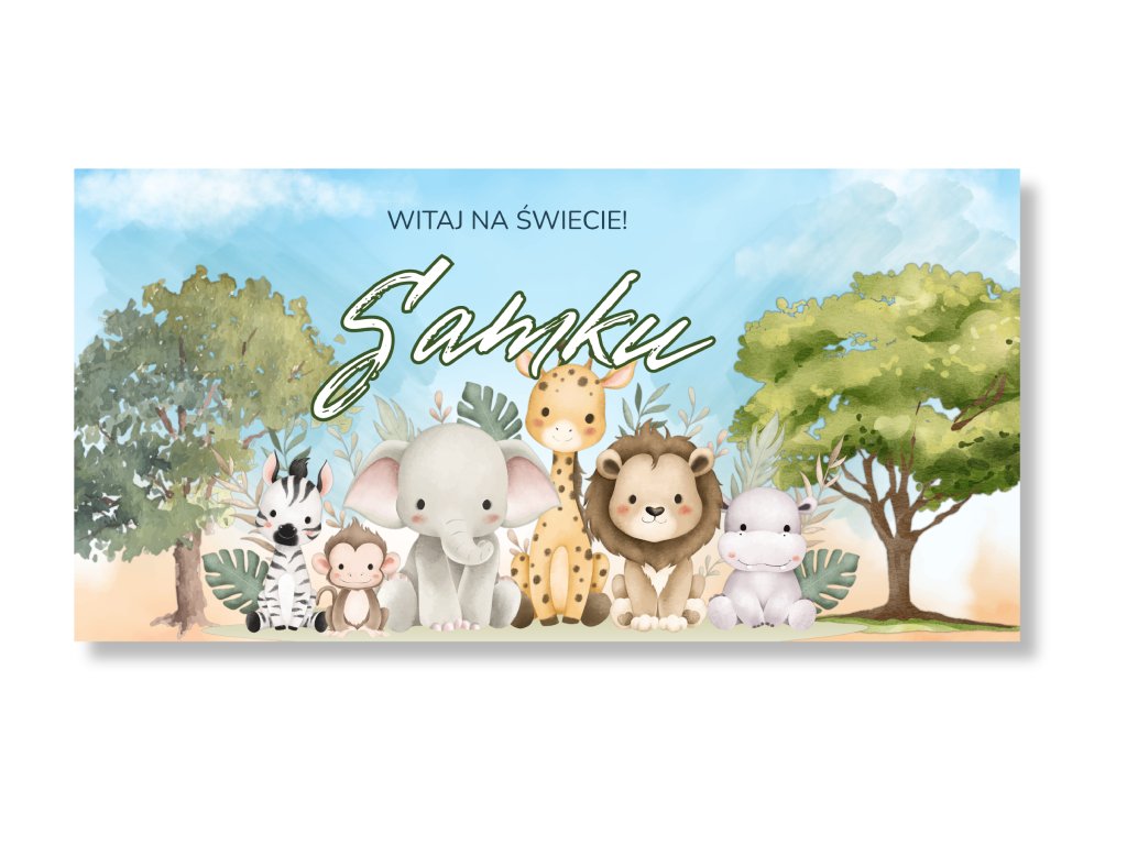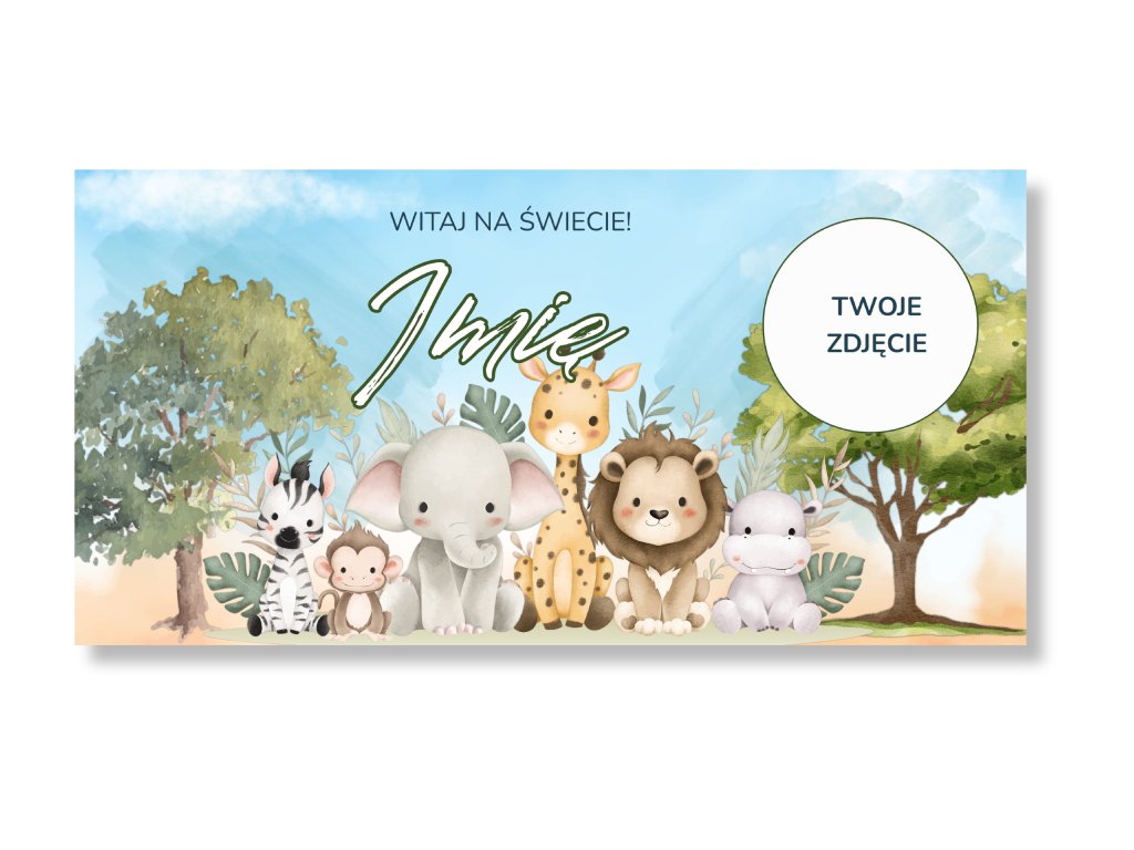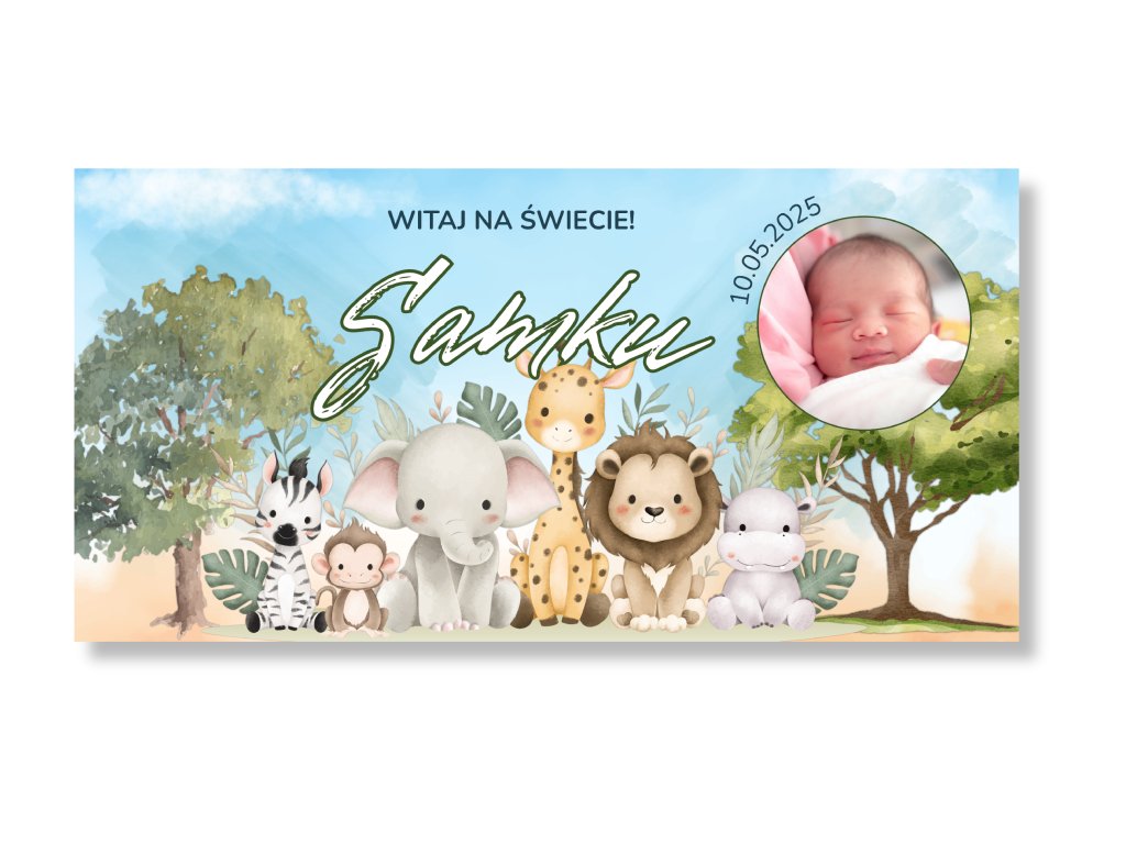 Baner w stylu safari doda uroczystości z okazji powitania maluszka na świecie radosną i pełną miłości atmosferę pełną przygody! Wystarczy dodać zdjęcie dziecka (np. z USG), ewentualnie imię i datę urodzenia – i ten wyjątkowy moment powitania może się rozpocząć. Ten spersonalizowany baner jest stworzony dla rodziców, którzy kochają naturę, zwierzątka i oryginalny styl.