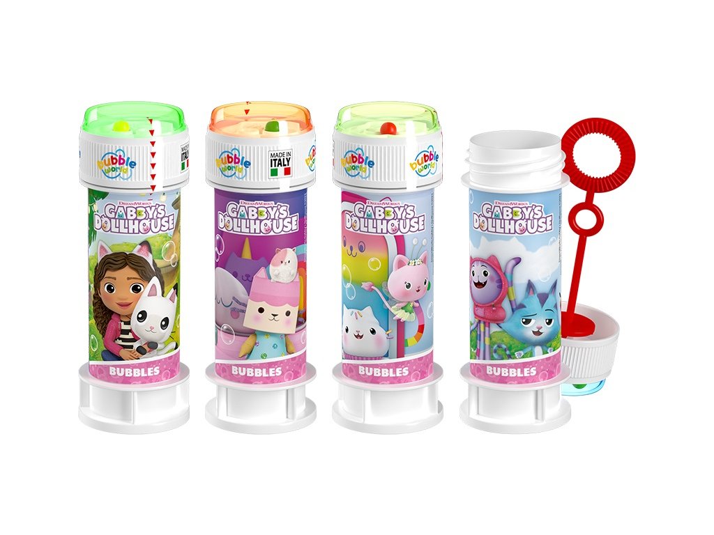 Przygotuj się na imprezę z bańkami mydlanymi z Domek Gabby! Wystarczy dmuchnąć, a wokół Ciebie rozlecą się setki błyszczących baniek, które rozświetlą każdy dzień. Z ulubionymi postaciami z Domku Gabby zabawa będzie jeszcze lepsza! Zabierz bąbelkowy płyn na plac zabaw, do parku lub na urodziny i ciesz się niekończącymi się chwilami śmiechu i radości. Kto złapie największą bańkę? Spróbuj właśnie Ty!