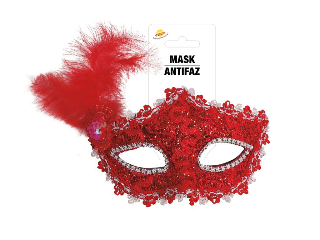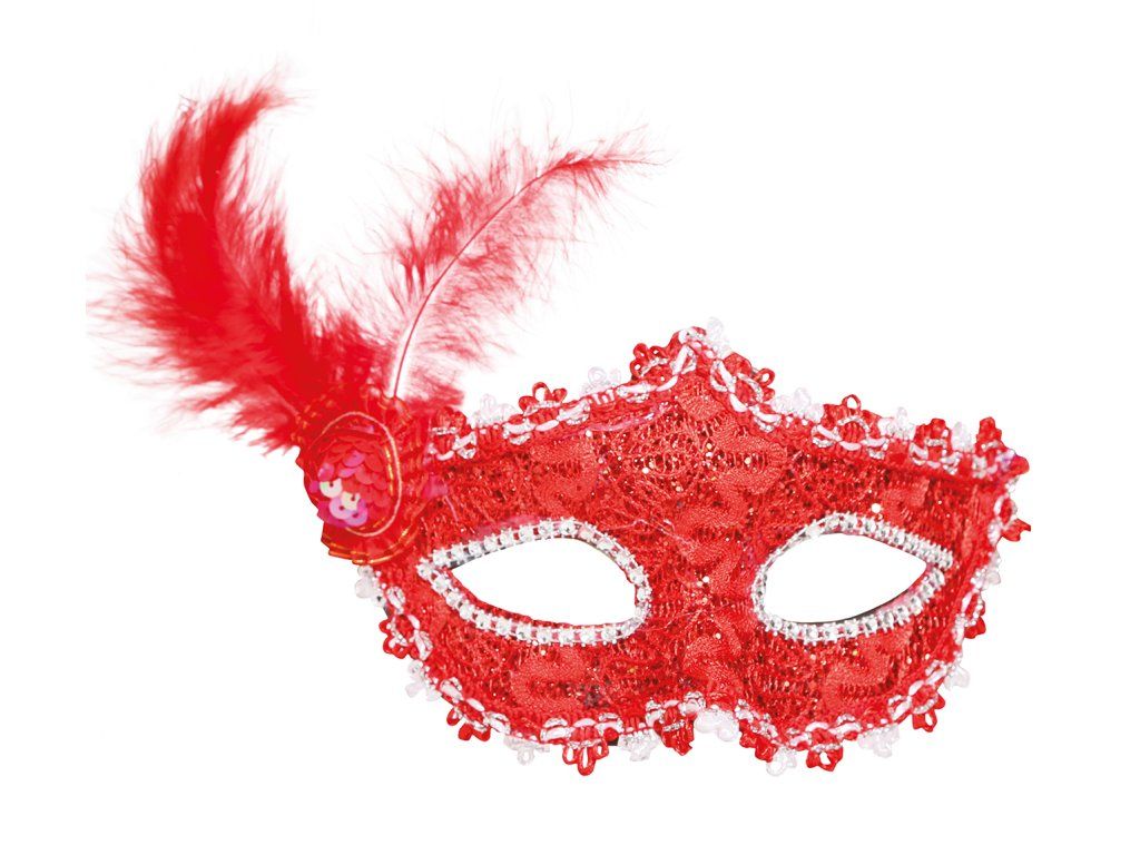 Czerwona maska z czerwonym piórkiem