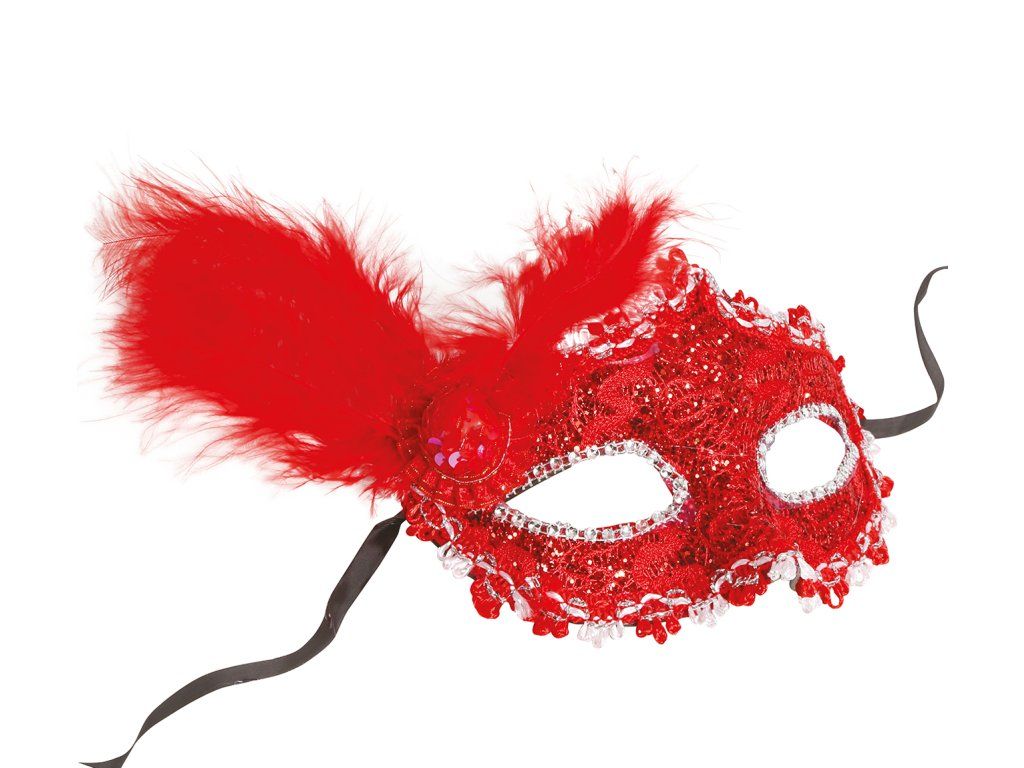 Czerwona maska na oczy z czerwonym piórkiem
