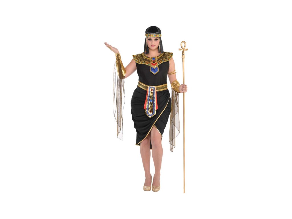 Czarna sukienka kopertowa nadaje egipskiemu kostiumowi mroczny charakter. Pasujący złoty kołnierz i pasek ozdobione są czerwonymi i niebieskimi klejnotami. Rękawy mają przymocowane welony z tęczowego materiału, a całość dopełnia imponująca złota opaska na głowę!