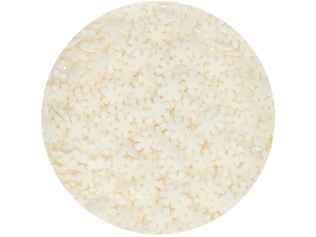Białe śnieżynki to jadalna dekoracja nadająca się do ozdabiania ciast, deserów, muffinek, pączków czy babeczek. Mogą być wykorzystane do uzupełnienia detali na tortach z motywem zimowym lub bożonarodzeniowym. Można je przykleić jadalnym klejem, lukrem królewskim lub czekoladą.