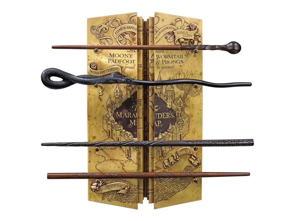 Dekoracja w postaci Mapy Huncwotów do zawieszenia i 4 czarodziejskich różdżek sławnych czarodziejów z serii o Harrym Potterze: Remusa Lupina, Siriusa Blacka, Jamesa Pottera i Petera Pettigrewa (Glizdogona).