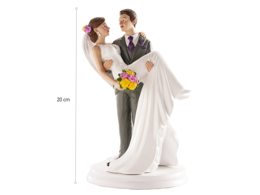 Romantyczna ozdoba na tort ukazuje delikatny moment, gdy pan młody trzyma pannę młodą na rękach. Dzięki wysokości 20 cm ta figurka jest eleganckim i wyrazistym dodatkiem każdej weselnej tortu. Dzięki precyzyjnym detalom oraz wysokiej jakości wykonania, doda ona Twojej dekoracji nutę miłości i wyjątkowości w tym wielkim dniu.