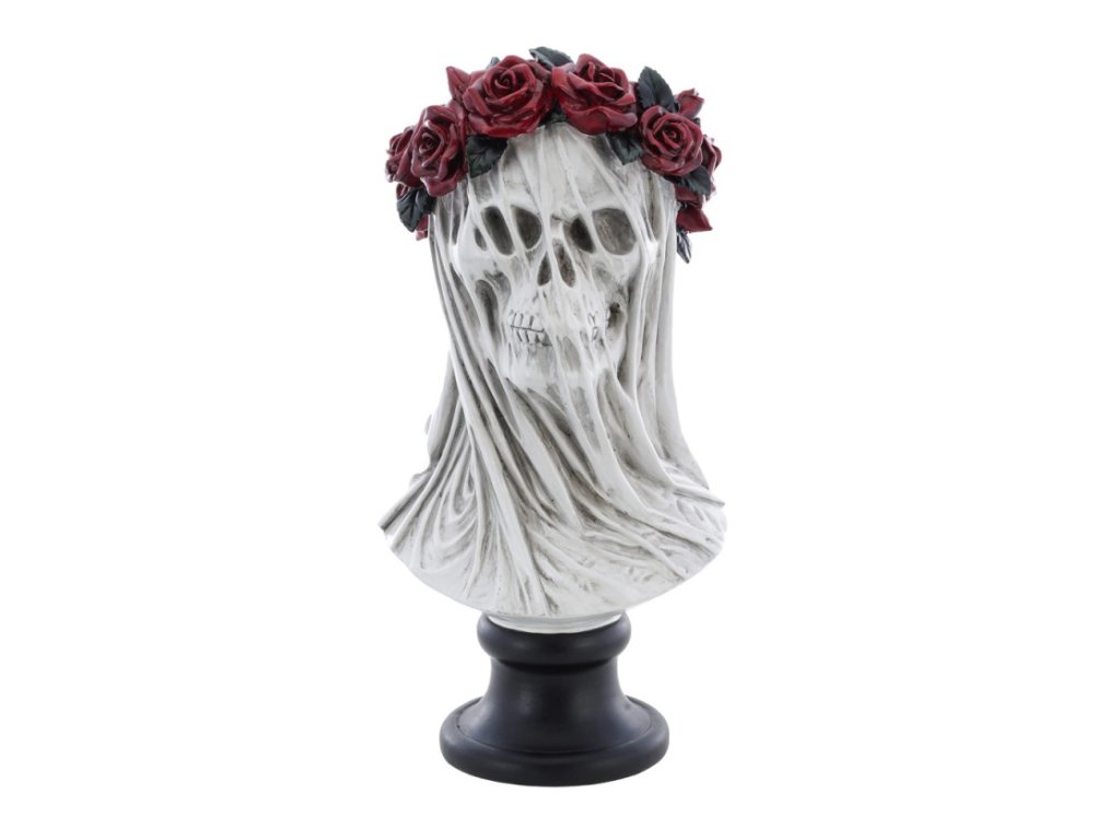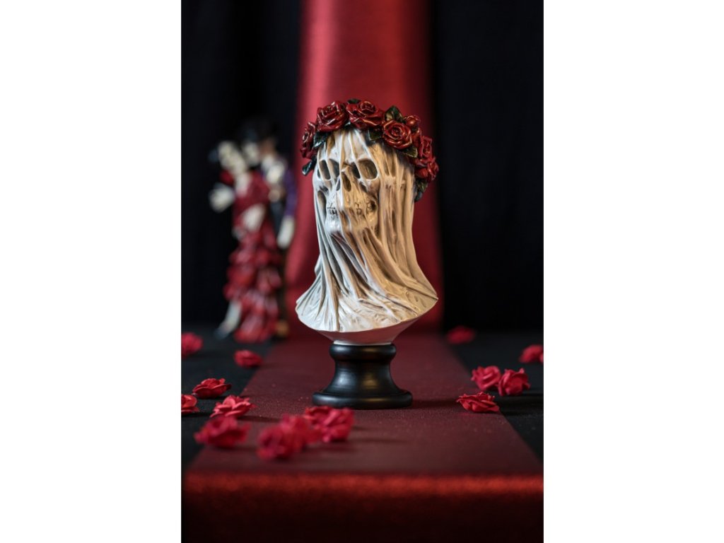 Dekoracyjne popiersie czaszki z welonem i czerwonymi różami 35,5 cm