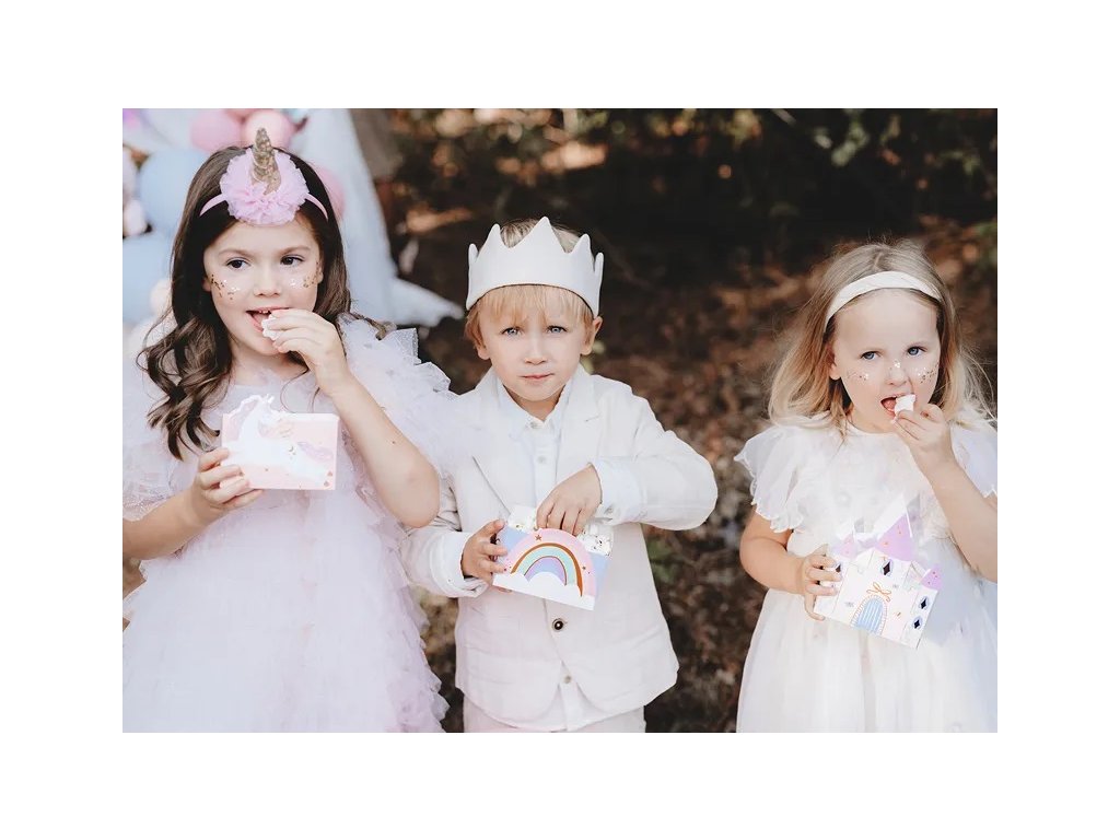 Świetne dekoracyjne pudełka z motywem jednorożca, zamku i tęczy mają wszechstronne zastosowanie. Pudełko papierowe może być używane nie tylko do popcornu, ale także do różnych imprezowych przekąsek, takich jak cukierki, ciastka, orzeszki, frytki itp. To praktyczne pudełko nadaje się na każde przyjęcie dla dzieci.