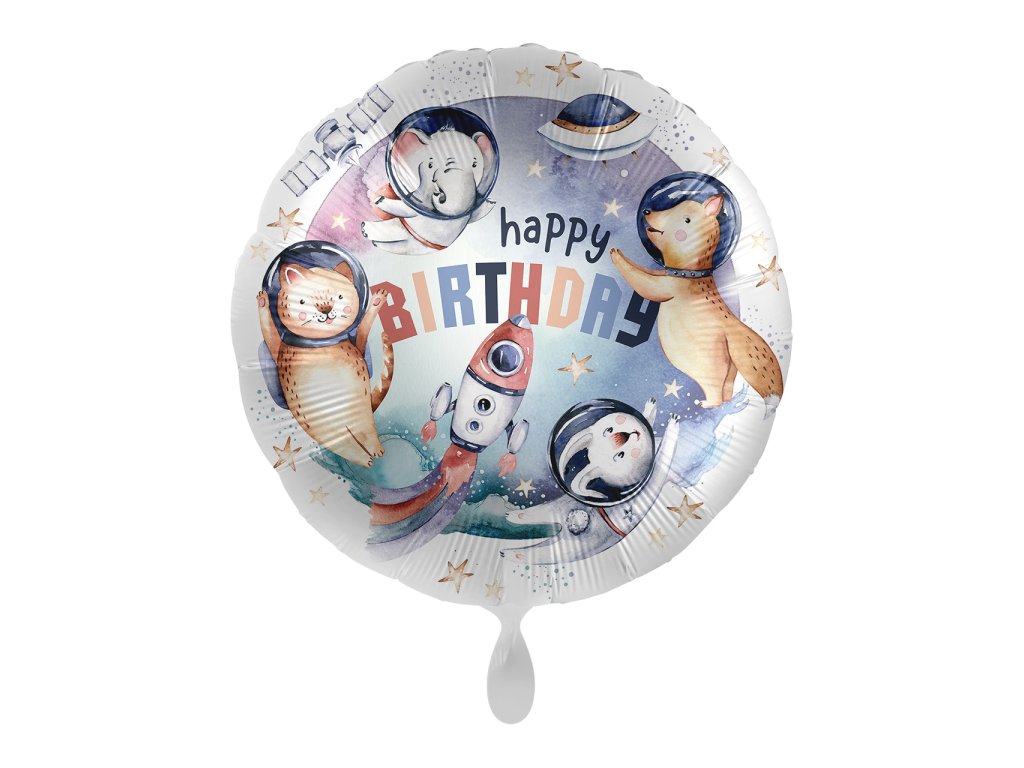 Ten okrągły foliowy balon z kolorowym nadrukiem "Happy Birthday" i kosmicznymi zwierzątkami to doskonały dodatek do dekoracji. Jest idealny jako dekoracja, prezent lub dodatek do urodzinowej aranżacji. Można go napełnić zarówno powietrzem, jak i helem.