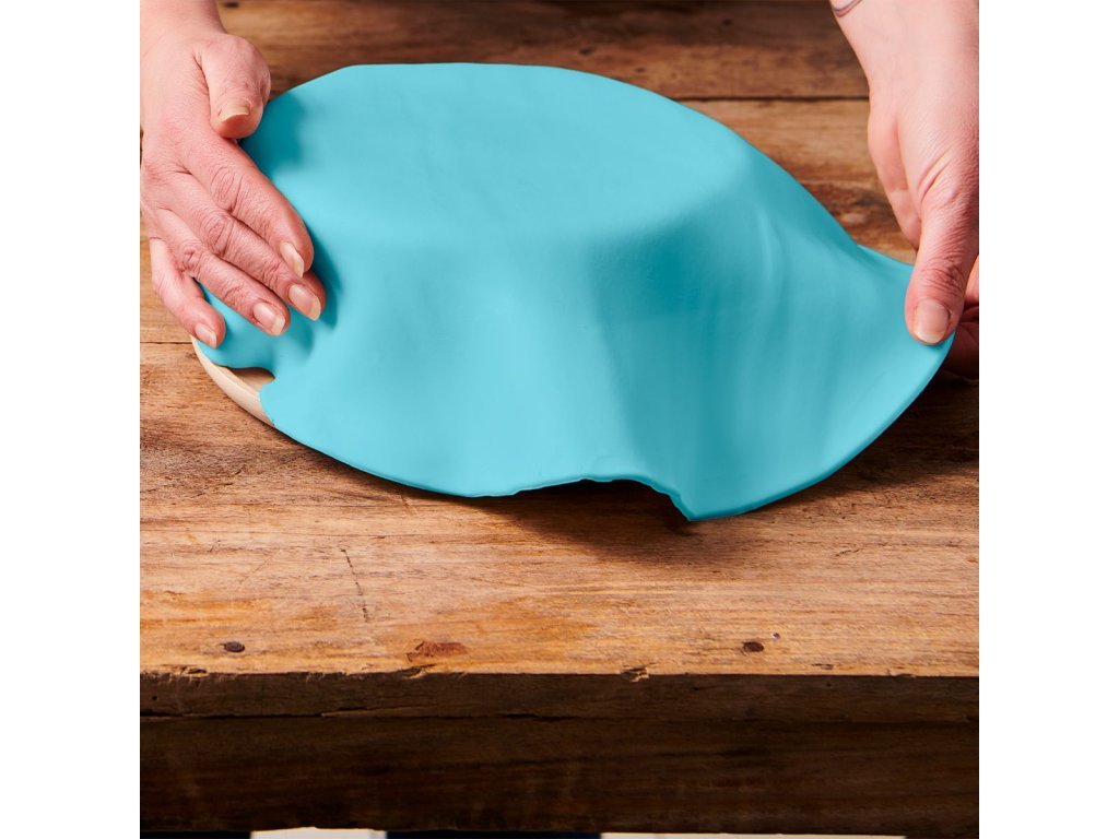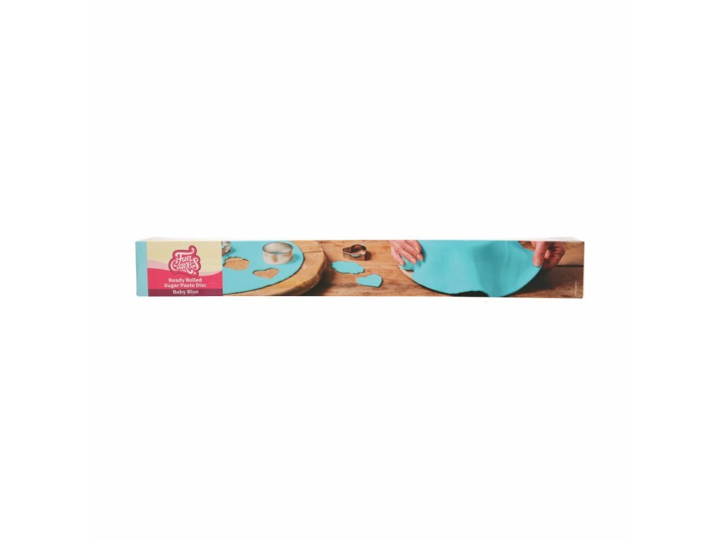 Jasnoniebieski rolowany fondant to gotowa masa, którą wystarczy położyć bezpośrednio na torcie. Dzięki temu, że fondant jest rozwijany, jest bardzo łatwy w obróbce i poradzi sobie z nim każdy domowy cukiernik. Fondant w kolorze baby blue idealnie nadaje się do pokrycia tortów z motywem chłopięcym lub do uczczenia narodzin dziecka. Produkt nie zawiera glutenu.