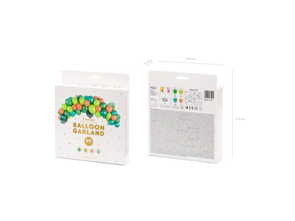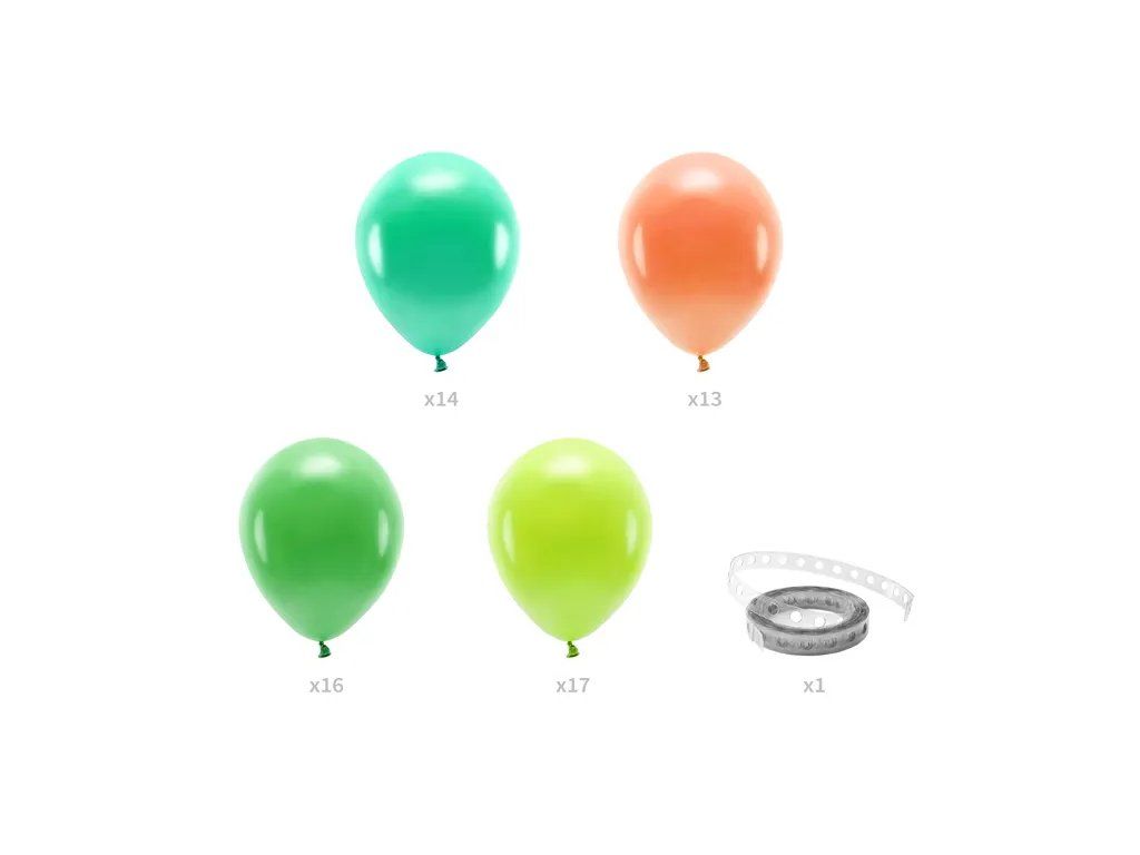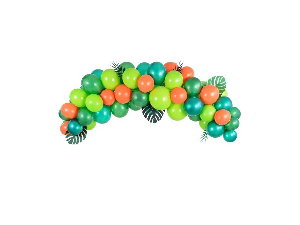 - Zawartość: 60 x balony (1 6 x metaliczny zielony, 17 x pastelowy zielony, 14 x metaliczny zielony, 13 x pastelowy pomarańczowy), 1 x przezroczysta girlanda balonowa 2,5 m