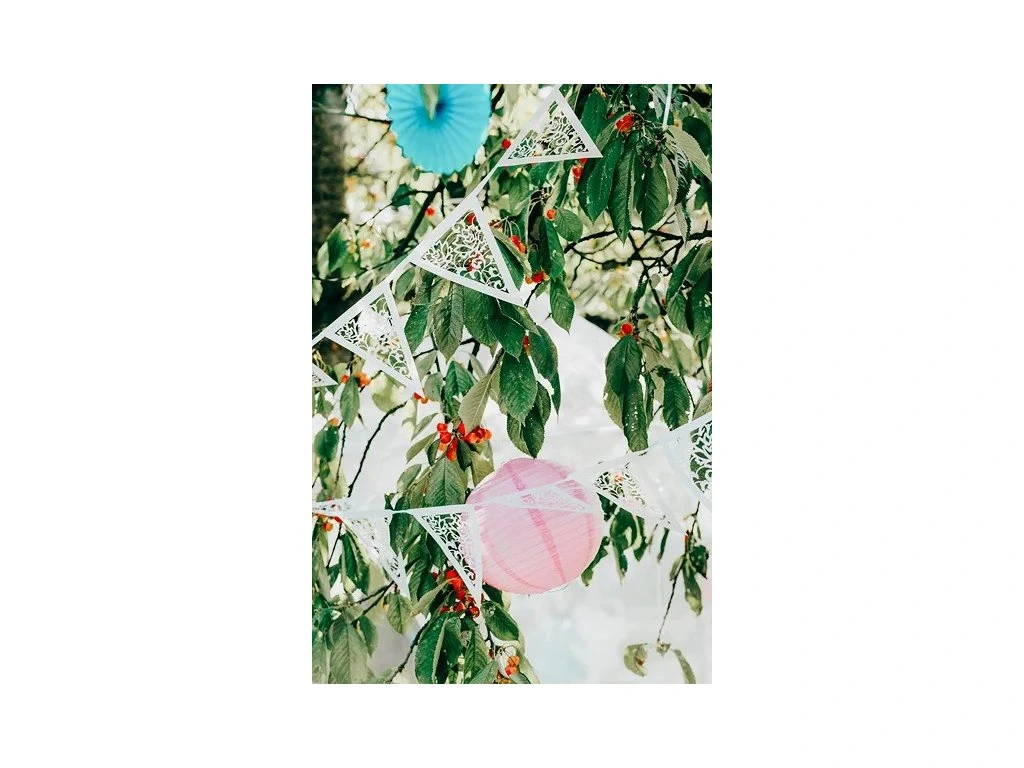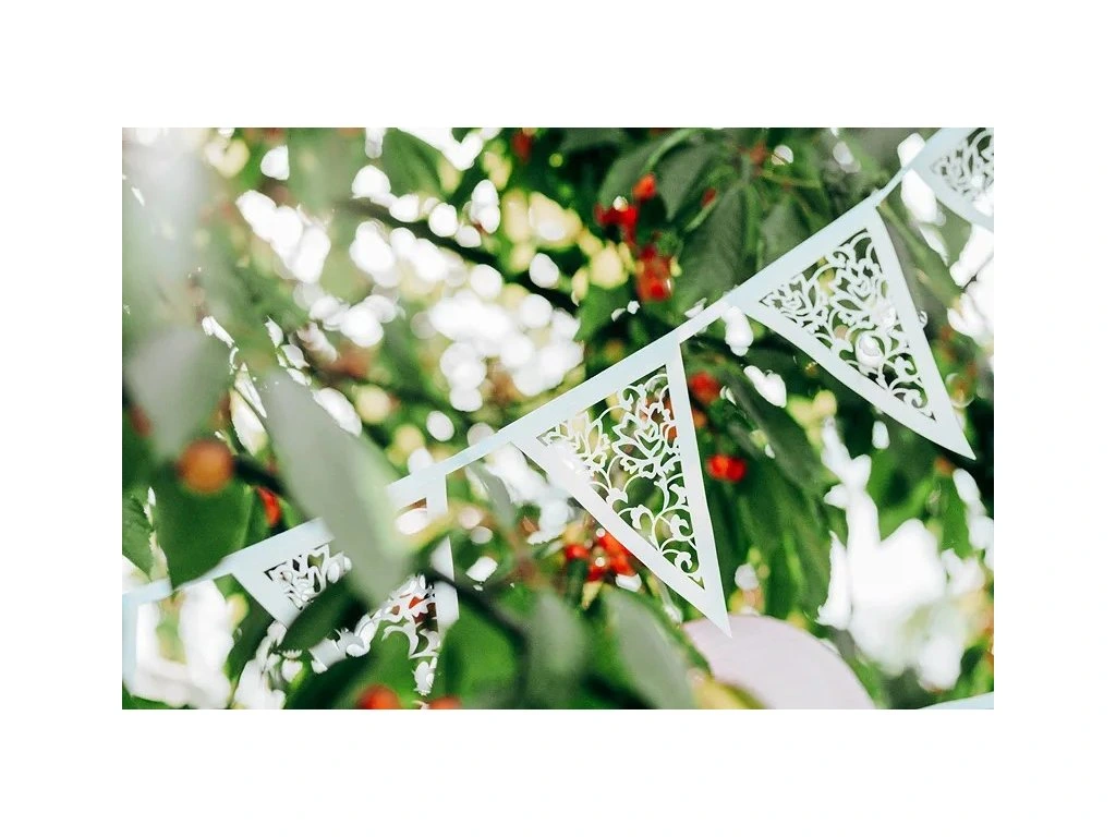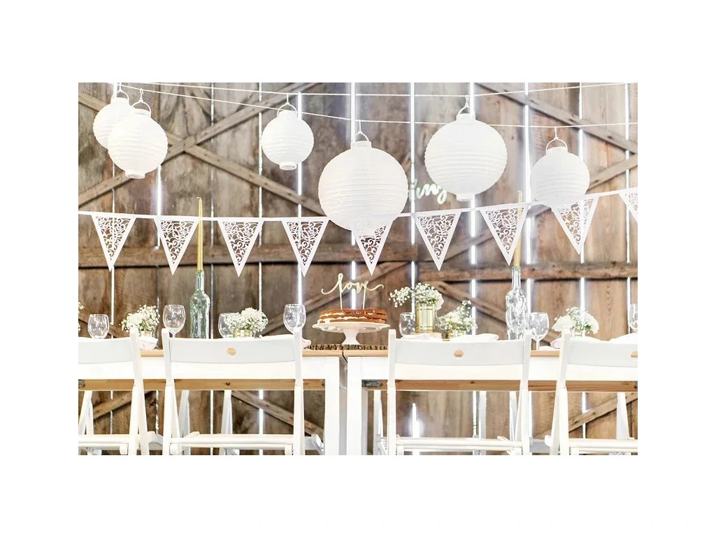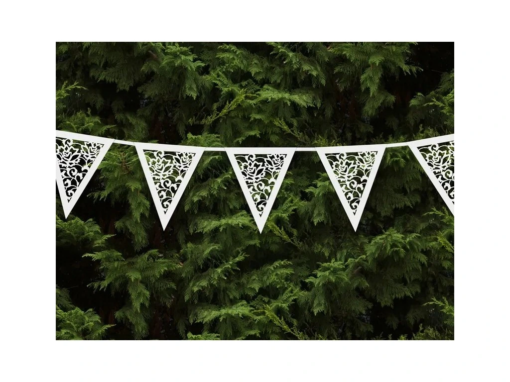 Spraw, aby Twoje przyjęcie było niezapomnianym momentem dzięki tej ozdobnej girlandzie! Girlanda z białego papieru składa się z flag z wyciętym kwiatowym wzorem. Romantyczny design gwarantuje, że girlanda doda Twojej uroczystości odpowiedni akcent świątecznej atmosfery.