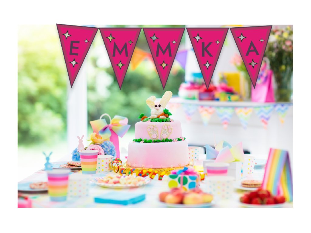 Twoja girlanda może zawierać dowolny tekst, który wybierzesz, o długości od 4 do 8 znaków. Możesz dodać imię solenizanta, słowo lub inne krótkie przesłanie, które chcesz podkreślić. Tekst może być wykonany w różnych stylach czcionki i kolorach, aby idealnie pasował do całego projektu.