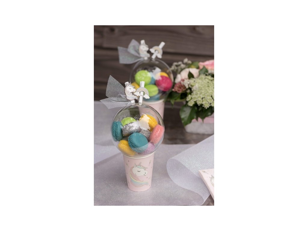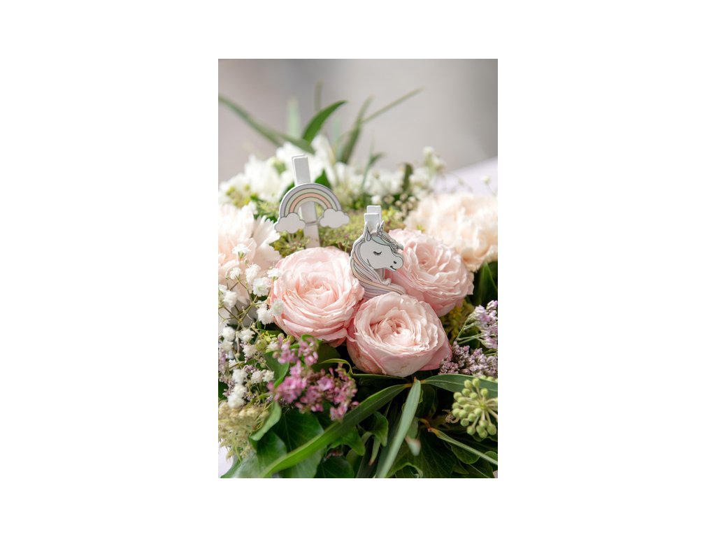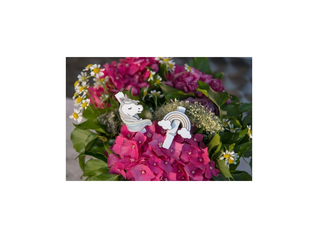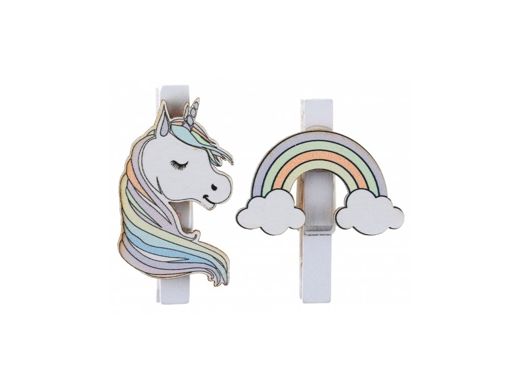 Drewniana klamerka dekoracyjna z motywem jednorożca i tęczy służąca do mocowania fotografii, obrazów, dekoracji. Jest to praktyczna ozdoba, która doskonale sprawdza się podczas przygotowywania imprezowych dekoracji na wszelkie imprezy dla dzieci.