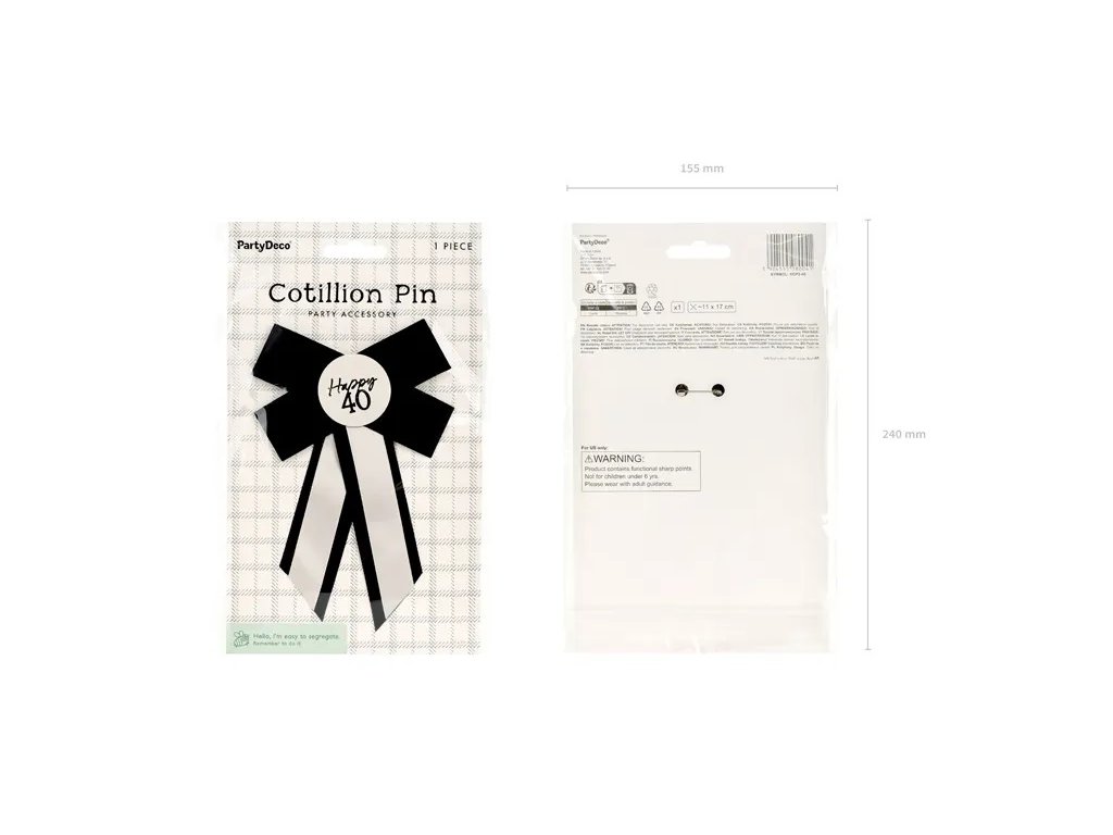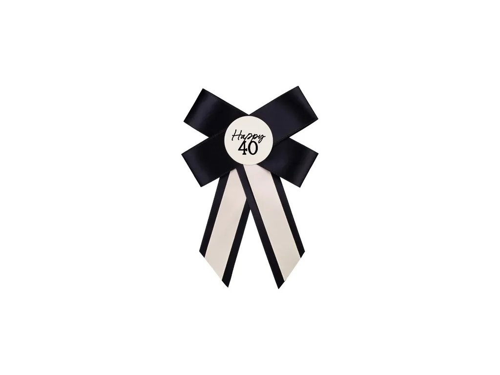 Kokarda na 40. urodziny – kremowo-czarna. Kończysz czterdzieści lat? Bez stresu, życie dopiero się zaczyna! Z tą kremowo-czarną kokardą solenizanta nie da się przeoczyć – może nawet stanie się nieodparty. Przypnij ją do piersi jubilata i patrz, jak zamienia się w króla lub królową imprezy! Niezależnie od tego, czy planujesz nadmuchać balony, tańczyć do białego rana, czy po prostu przyjmować życzenia z uśmiechem, ta kokarda doda Twojemu świętowaniu idealnego stylu. Świętuj czterdziestkę z klasą, humorem i mnóstwem zabawy – bo czterdzieści to tylko liczba, a śmiechu nigdy za wiele!