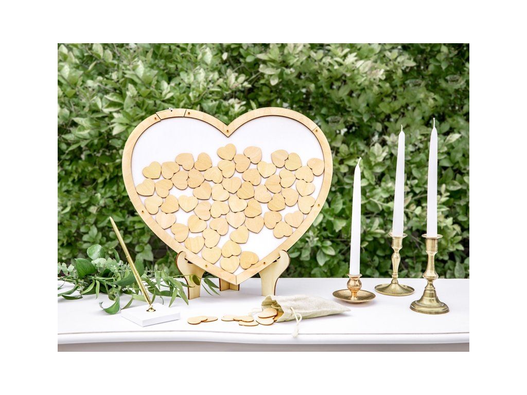 Wspaniała księga gości w kształcie drewnianego serca – sprawi, że Twoja impreza będzie jeszcze lepsza. Księga składa się z 70 serc, które mogą zostać wypełnione życzeniami od Twoich gości.