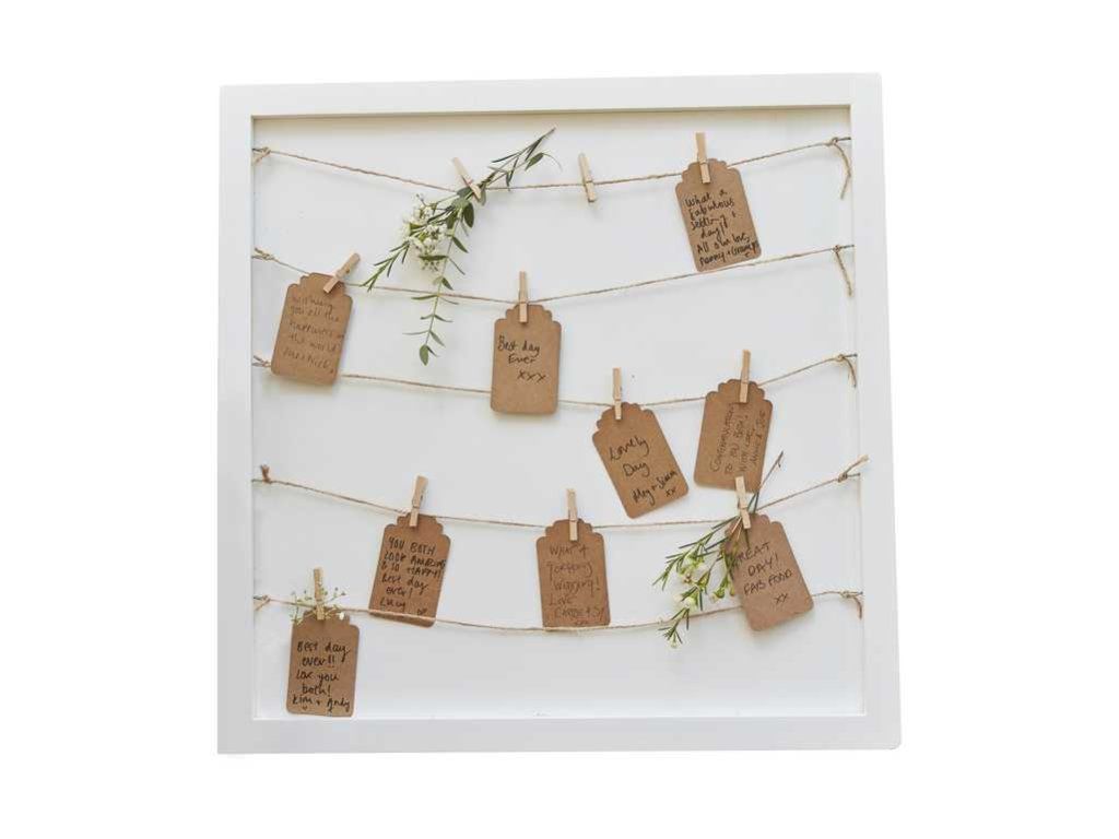 Drewniana ramka z naturalnym sznurkiem, klamerkami i kartkami, na których każdy z gości może napisać swoje życzenia dla nowożeńców. Ta oryginalna księga gości weselnych na pewno Ci się nie znudzi i nawet po latach będziesz z przyjemnością czytać wiadomości i gratulacje od przyjaciół i rodziny..