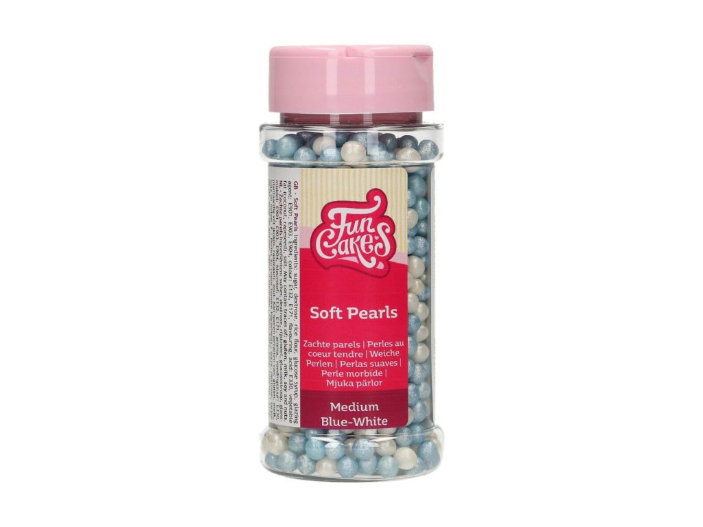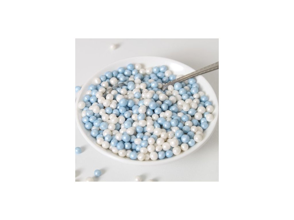 Kulki cukrowe Soft Pearls to miękka i delikatna posypka cukiernicza, dzięki czemu nadają się do deserów dla dzieci. Niebiesko-białe jadalne kulki doskonale nadają się do dekoracji tortów dla chłopców, dodają luksusowego akcentu tortom i mini deserom.