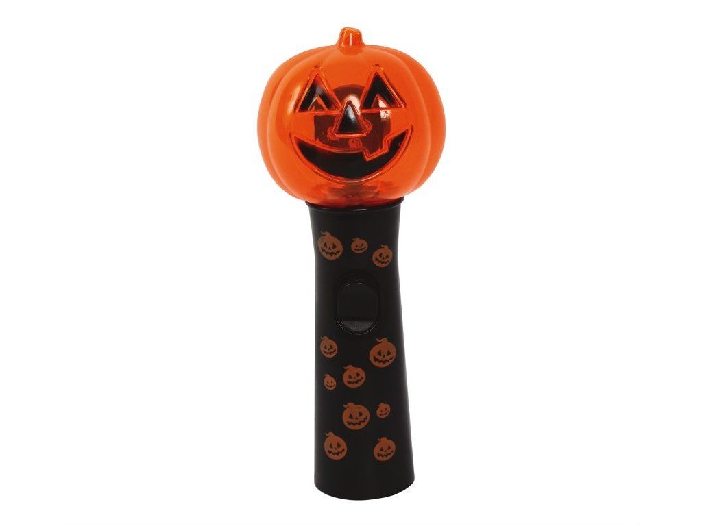 Ta świecąca latarka z motywem dyni jest świetnym gadżetem na imprezę Halloween albo karnawał. Dzięki niej w ciemności stworzysz straszną atmosferę. Zaskocz gości niespodziewanym efektem świetlnym.