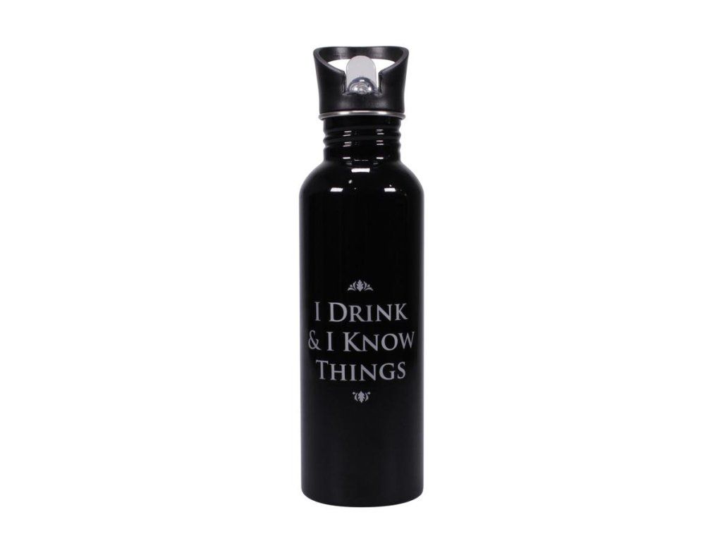 Ta stylowa butelka w ciemnym odcieniu z logo Game of Thrones i napisem "I Drink & I Know Things" jest doskonałym prezentem dla fanów Gry to tron.