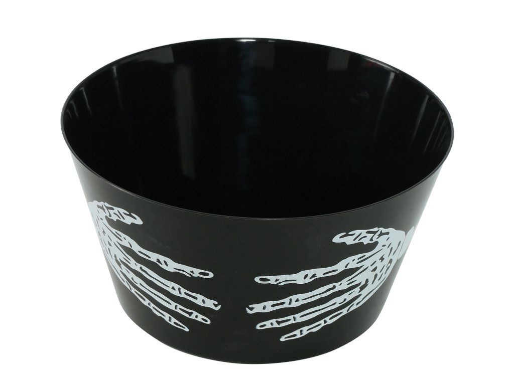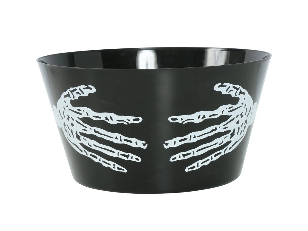 Ożyw imprezę halloween gadżetami jak ta straszna miska z motywem kościotrupa na słodkie poczęstunki i różne przysmaki.