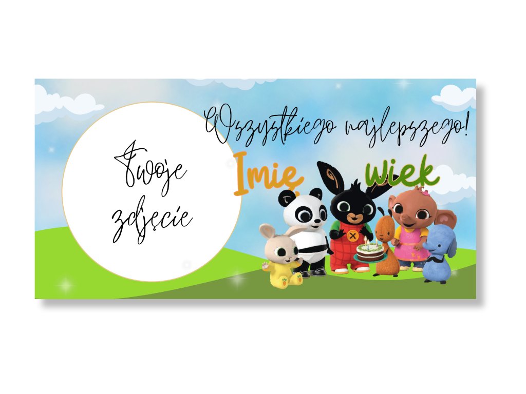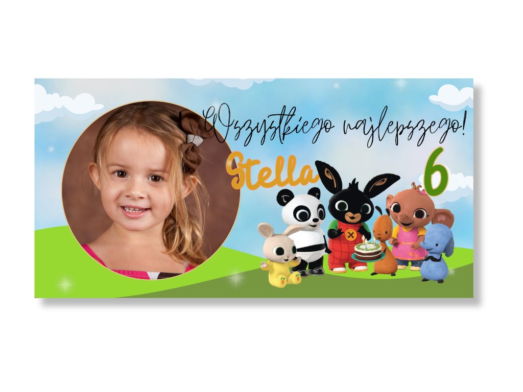 Baner w stylu Binga doda urodzinowej uroczystości uroczego, radosnego i przyjaznego klimatu, który pokochają zwłaszcza najmłodsi jubilaci. Wystarczy dodać zdjęcie dziecka, imię i wiek – i wyjątkowa impreza z Bingiem może się zacząć! Ten personalizowany baner ucieszy każdego małego fana czarnego króliczka i jego przyjaciół.
