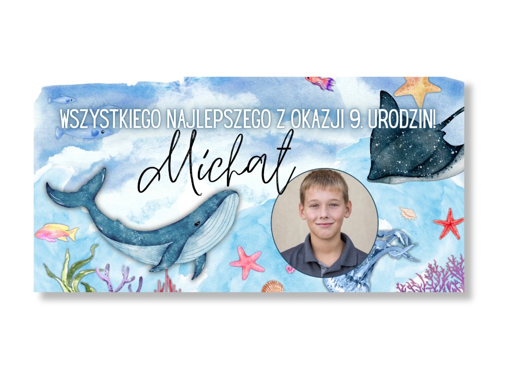 Baner w stylu oceanu doda urodzinowej imprezie świeżą, morską atmosferę pełną przygody i fantazji! Wystarczy dodać zdjęcie solenizanta, imię oraz wiek – i wyjątkowa impreza niczym nad morzem może się rozpocząć. Ten spersonalizowany baner ucieszy każdego, kto kocha fale, plaże i podwodny świat.
