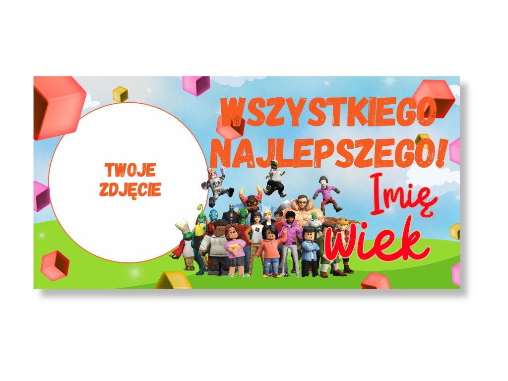 Baner w stylu Roblox doda urodzinowej imprezie mnóstwo zabawy, przygody i kolorów! Wystarczy dodać zdjęcie solenizanta, imię oraz wiek – i niezapomniana impreza Roblox może się rozpocząć. Ten spersonalizowany baner ucieszy każdego małego gracza i fana popularnego, kreatywnego świata online.