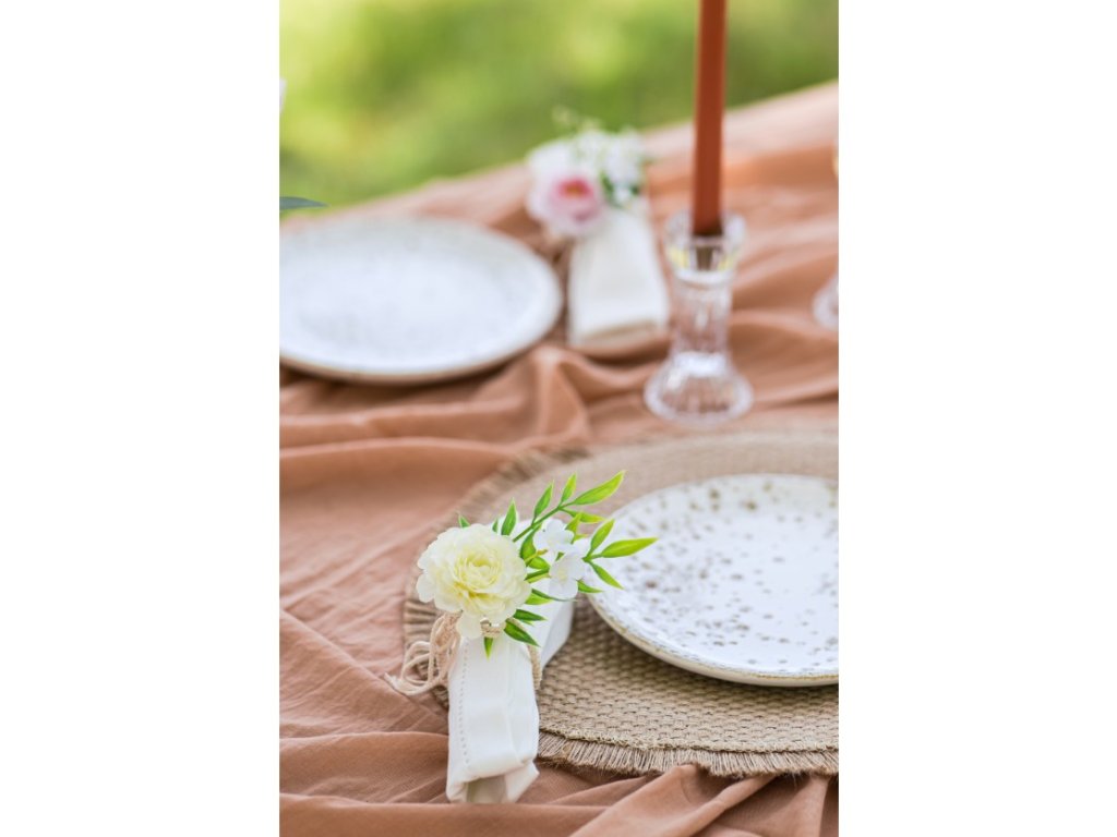 Pierścień na serwetki z kwiatem to elegancki dodatek, który nada twojemu nakryciu stołu wyjątkowy, naturalny charakter. Ten starannie wykonany produkt jest zrobiony z wysokiej jakości materiałów i ozdobiony realistycznym kwiatem. Idealny na wesela, rodzinne uroczystości czy romantyczne kolacje.