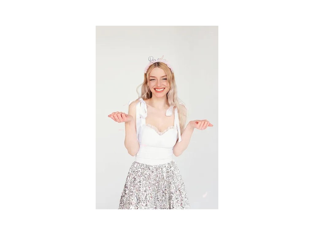 Opaska dla panny młodej z falbanką 17,5 x 18 cm Przygotuj się na wieczór pełen śmiechu, tańca i niezapomnianych przeżyć! Ta opaska dla panny młodej z uroczą falbanką to dokładnie to, czego potrzebujesz, aby stać się gwiazdą każdego wieczoru panieńskiego, imprezy urodzinowej czy szalonej zabawy. Wystarczy ją założyć, uśmiechnąć się i nagle stajesz się królową parkietu, magnesem na komplementy oraz główną bohaterką wszystkich selfie! Z tą opaską na pewno nie pozostaniesz niezauważona – będziesz gotowa do zabawy do białego rana, tańców na stole i śmiechu, który roznosi się po całym pomieszczeniu. Nie czekaj więc, załóż falbankę i pokaż wszystkim, że to właśnie ty wiesz, jak się naprawdę bawić!