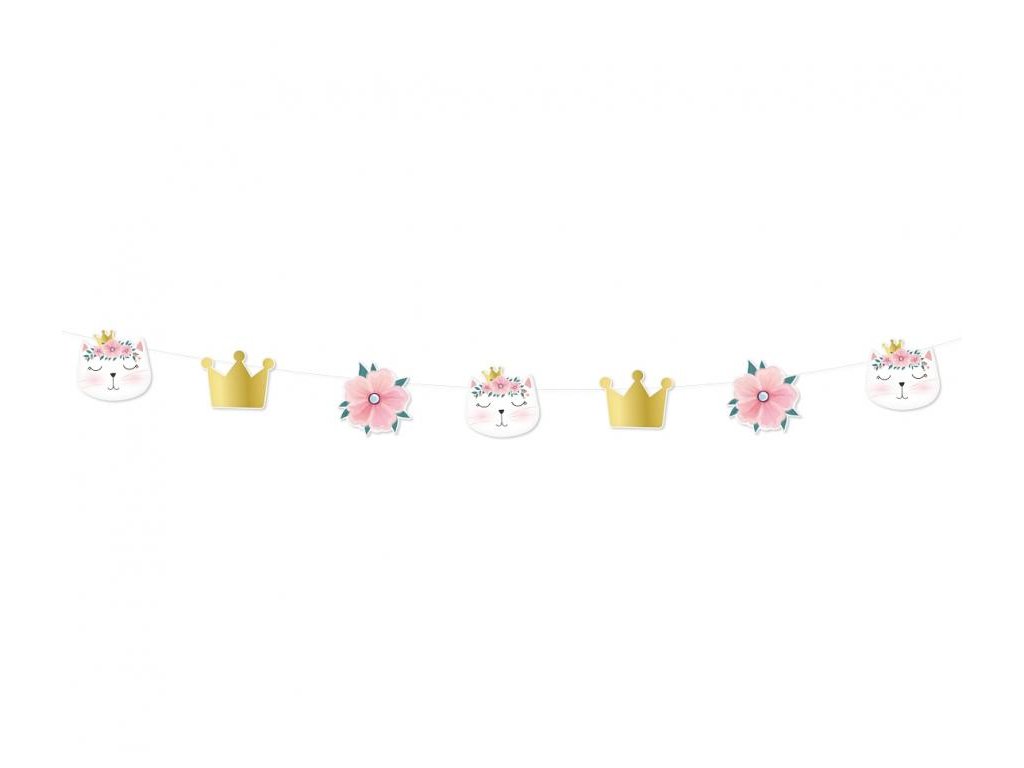 Girlanda z motywem kota pomoże Ci stworzyć niezwykłą imprezową dekorację. Bez girlandy żadna impreza urodzinowa nie będzie tym samym. Girlanda z motywem kota, kwiatów i złotych koron doskonale urozmaici wystrój każdej dziecięcej imprezy niezależnie od okazji.