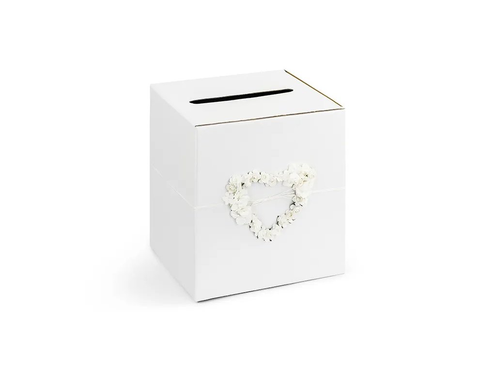 To pudełko na życzenia lub pieniądze nie tylko uzupełni twoją dekorację weselną, ale także pomoże przechowywać drobne prezenty od gości. Pudełko zdobione jest kremowym kwiatowym serduszkiem i posiada otwór do wrzucania kopert.