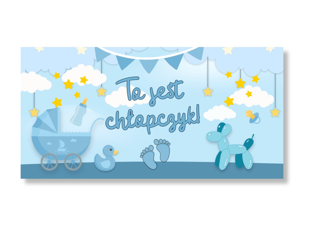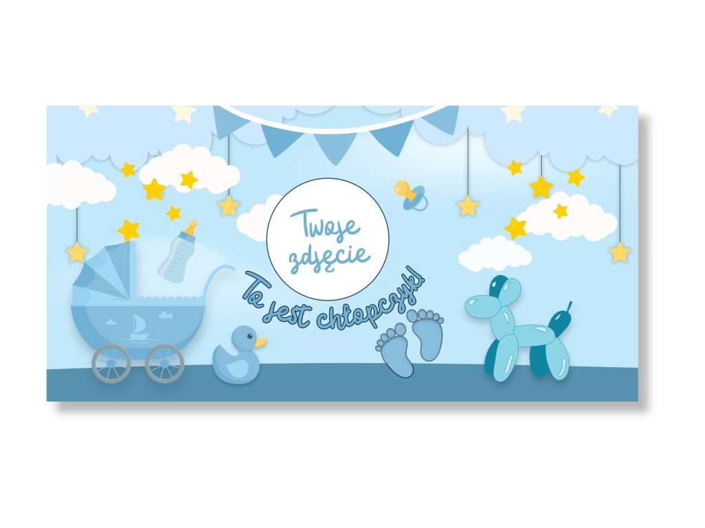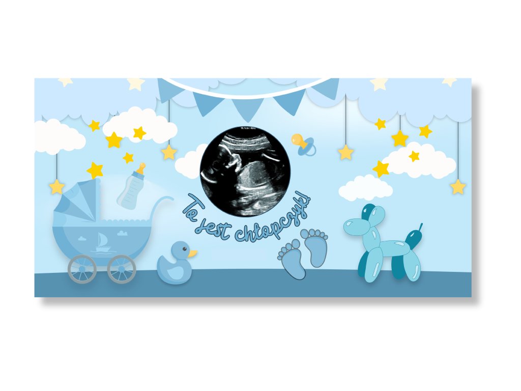 Baner z motywem Baby Shower dla chłopca doda uroczystości delikatnej i radosnej atmosfery pełnej oczekiwania! Do wyboru są dwie opcje – możesz wybrać wersję ze zdjęciem przyszłej mamy lub zdjęciem USG dla bardziej osobistego akcentu, albo wariant bez zdjęcia z uniwersalnym designem, który pasuje na każde baby shower.