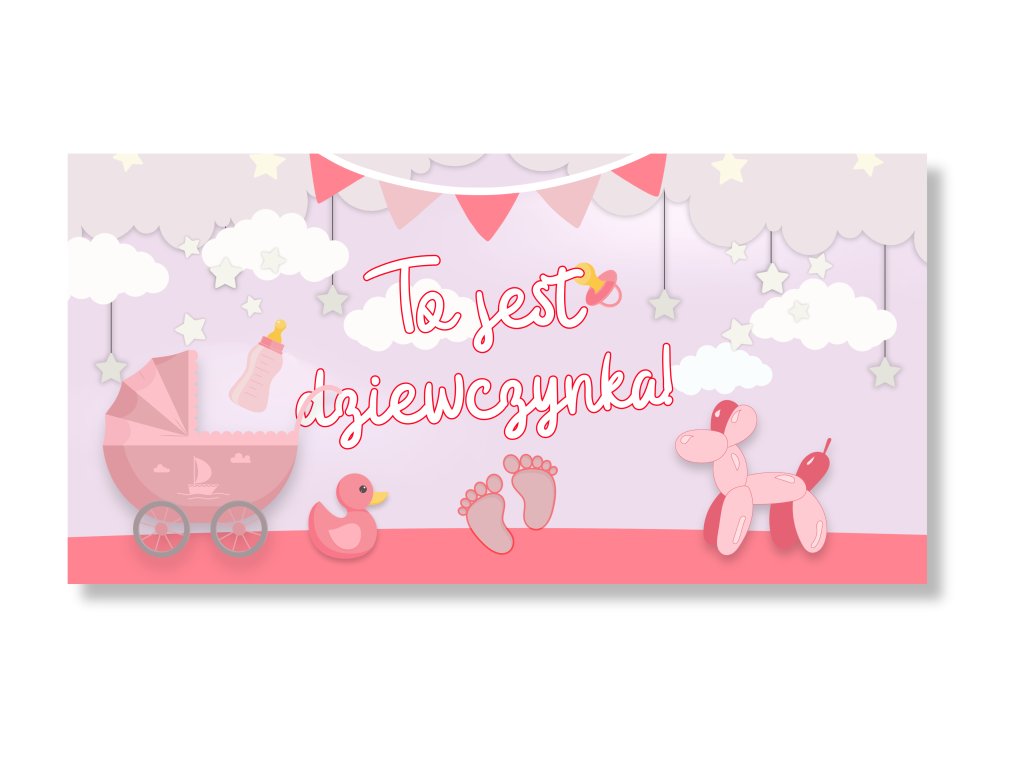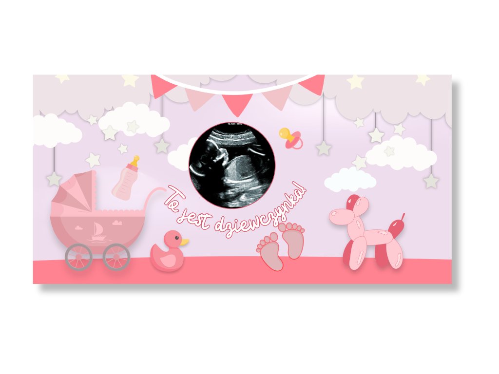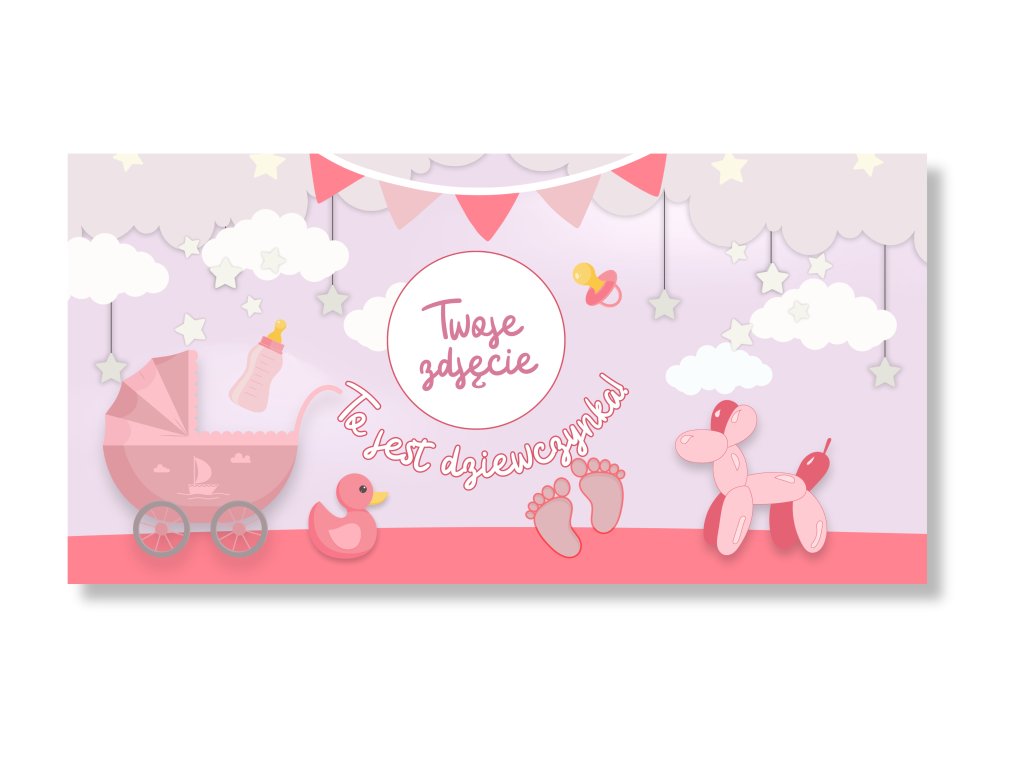 Baner z motywem Baby Shower dla dziewczynki doda przyjęciu delikatną i radosną atmosferę pełną oczekiwania! Do wyboru masz dwie opcje – możesz wybrać wersję ze zdjęciem przyszłej mamy lub USG dla bardziej osobistego akcentu, albo wariant bez zdjęcia z uniwersalnym wzorem, który pasuje na każde baby shower.