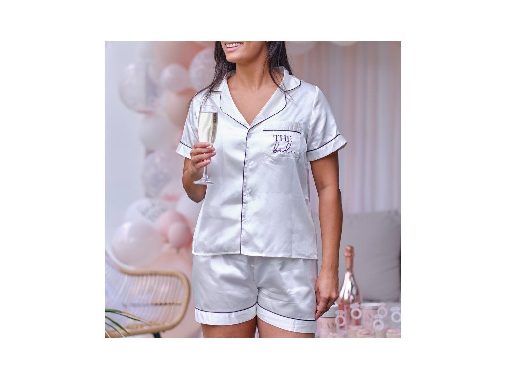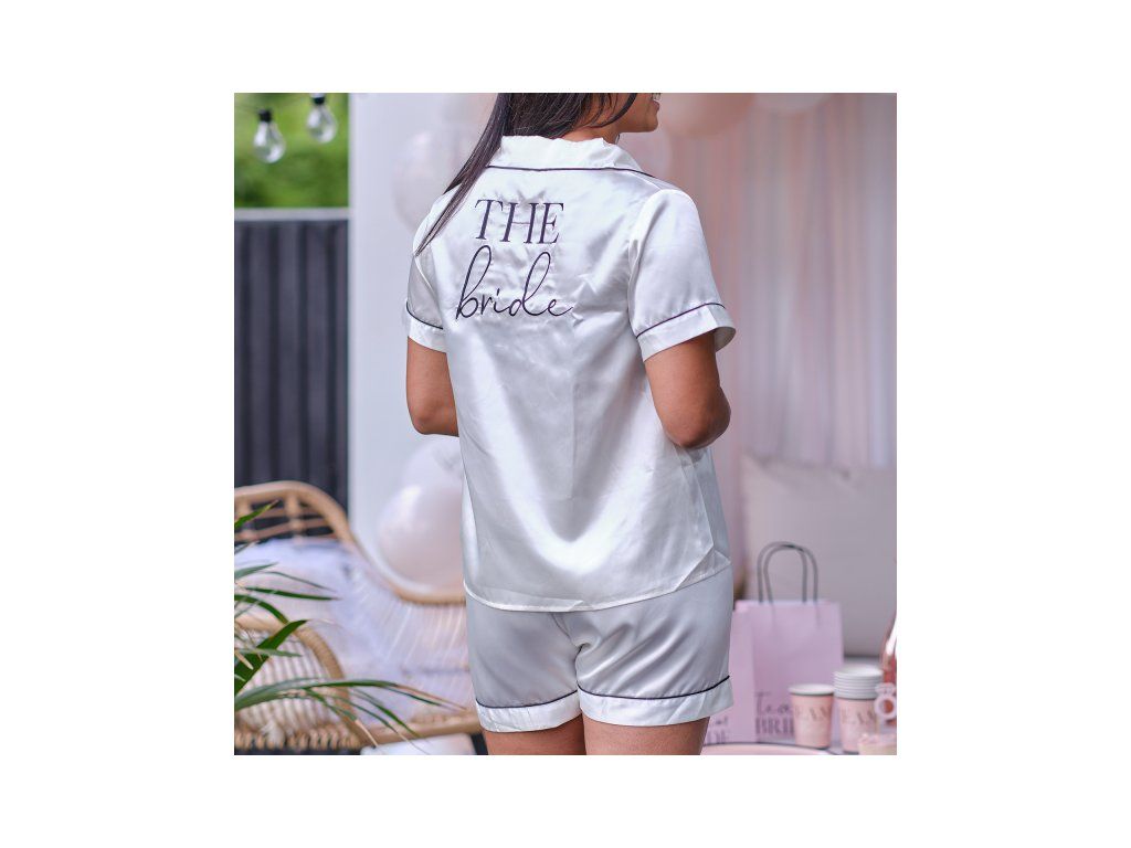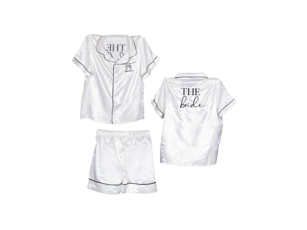Luksusowa biała dwuczęściowa piżama ma piękne ciemne lamówki, naszywkę z przodu i z tyłu z napisem „The bride”, kołnierzyk i zapinanie na guziki. Górna część ma krótki rękaw, a dolną tworzą szorty. Piżama jest wykonana z miękkiej, gładkiej białej tkaniny. Ta piękna piżama została zaprojektowana tak, abyś wyglądała i czuła się pięknie podczas swojego wieczoru panieńskiego lub rano w dniu ślubu.