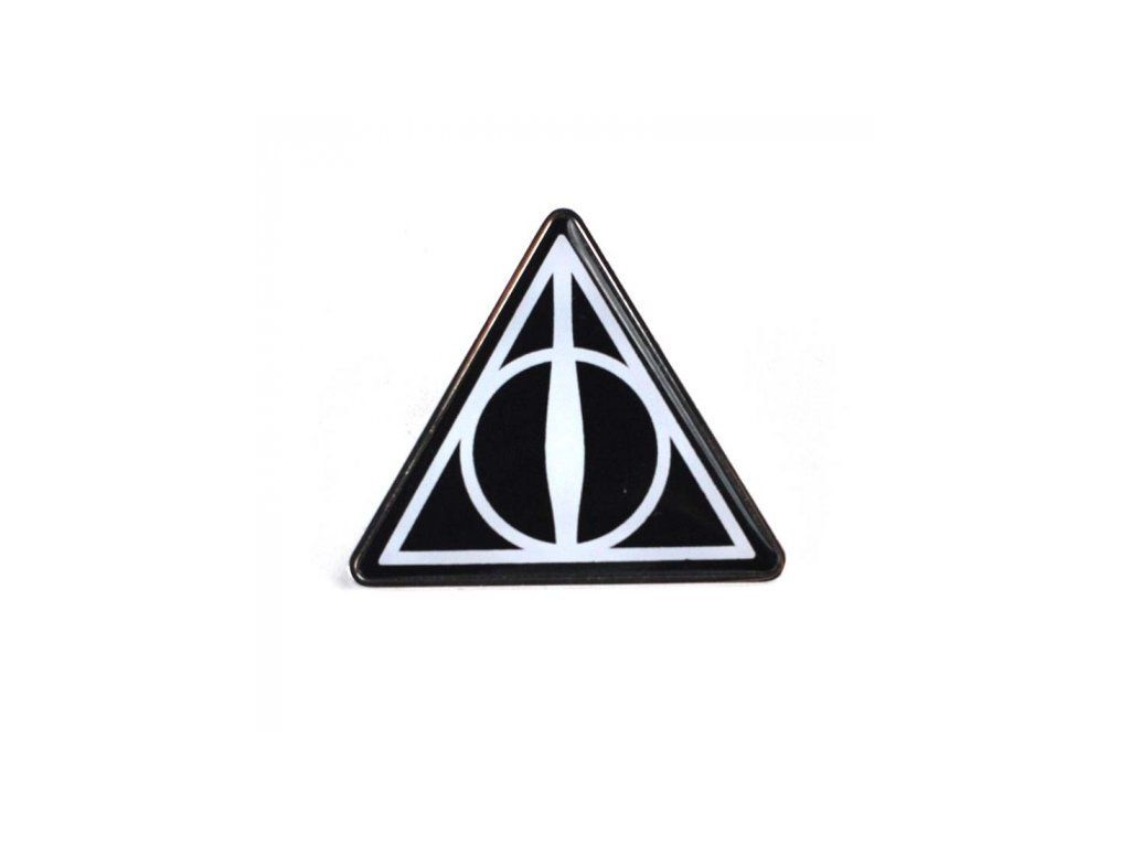Metalowa odznaka z symbolem Insygniów Śmierci - trzech przedmiotów, które uczyniłyby czarodzieja lub czarownicę, będącego ich właścicielem, jedynym władcą śmierci.