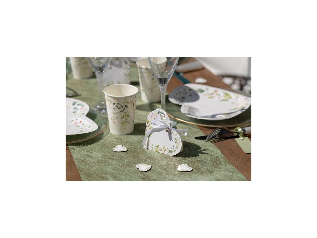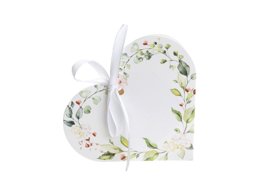 To ciekawe kartonowe pudełko z motywem kwiatowym ma kształt serca i jest przewiązane satynową tasiemką.