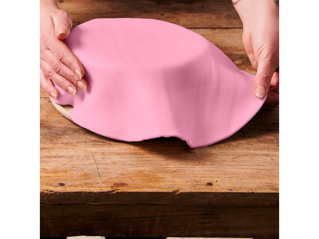 Różowy rozwałkowany fondant to wstępnie przygotowana masa, którą można umieścić bezpośrednio na torcie. Dzięki temu, że fondant jest rozwałkowany, bardzo łatwo się z nim pracuje i poradzi sobie z nim każdy domowy cukiernik. Fondant w kolorze różowym jest idealny do tworzenia dziewczęcych i damskich tortów. Produkt nie zawiera glutenu.
