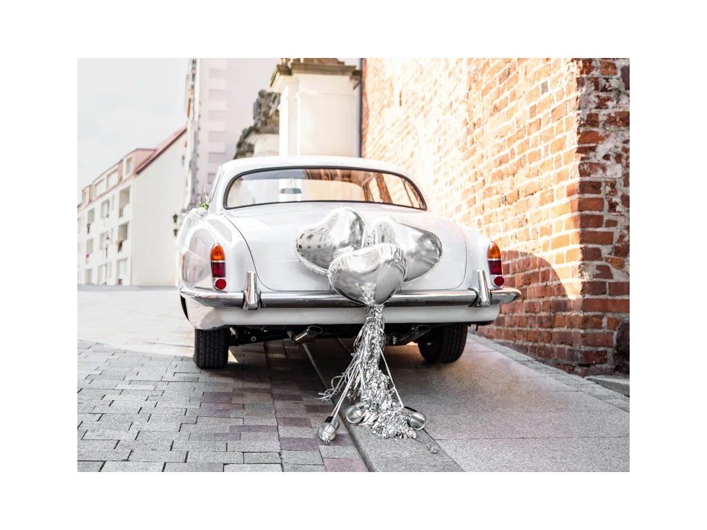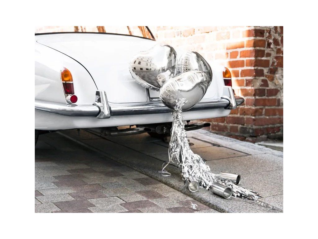 Dekoracja ślubna na samochód wniesie do Waszego dnia romantykę i odrobinę pasji. Wzbogać Was samochód o osobisty akcent dzięki tej srebrnej balonowej dekoracji, która może być dopełniona srebrną zawieszaną girlandą i puszkami. Ta wyrazista dekoracja będzie się wyróżniać i wniesie do całego wydarzenia wyjątkowy czar, który będzie niezapomniany nie tylko dla Was, ale także dla wszystkich Waszych bliskich!