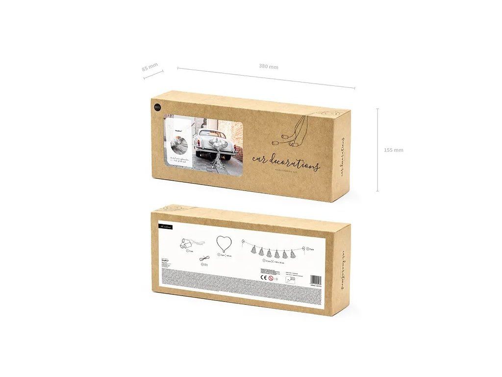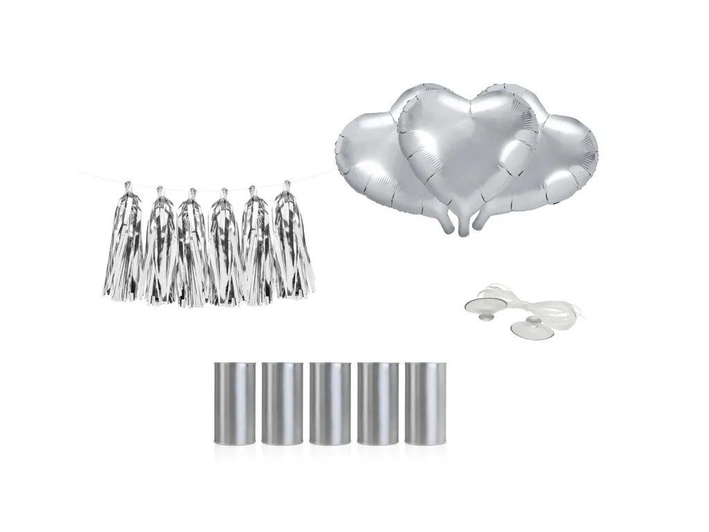 - zawartość: 3x balon foliowy w kształcie serca, 1x girlanda z frędzlami, 5x srebrna puszka, 6 x przyssawka, 12m nylonowy sznurek