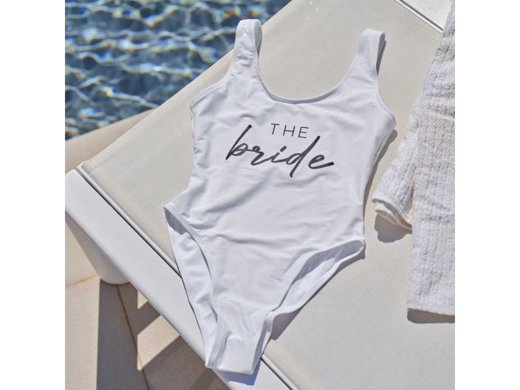 Damski jednoczęściowy strój kąpielowy to prosty, a jednocześnie seksowny element garderoby, który po prostu pokochasz! Strój kąpielowy dla panny młodej z napisem "The Bride" w białym kolorze to elegancki i stylowy dodatek na jej wieczór panieński, podróż poślubną lub wakacje na plaży. Ten strój kąpielowy świetnie sprawdzi się także w cieplejsze dni, noszony jak body z dżinsowymi szortami z wysokim stanem