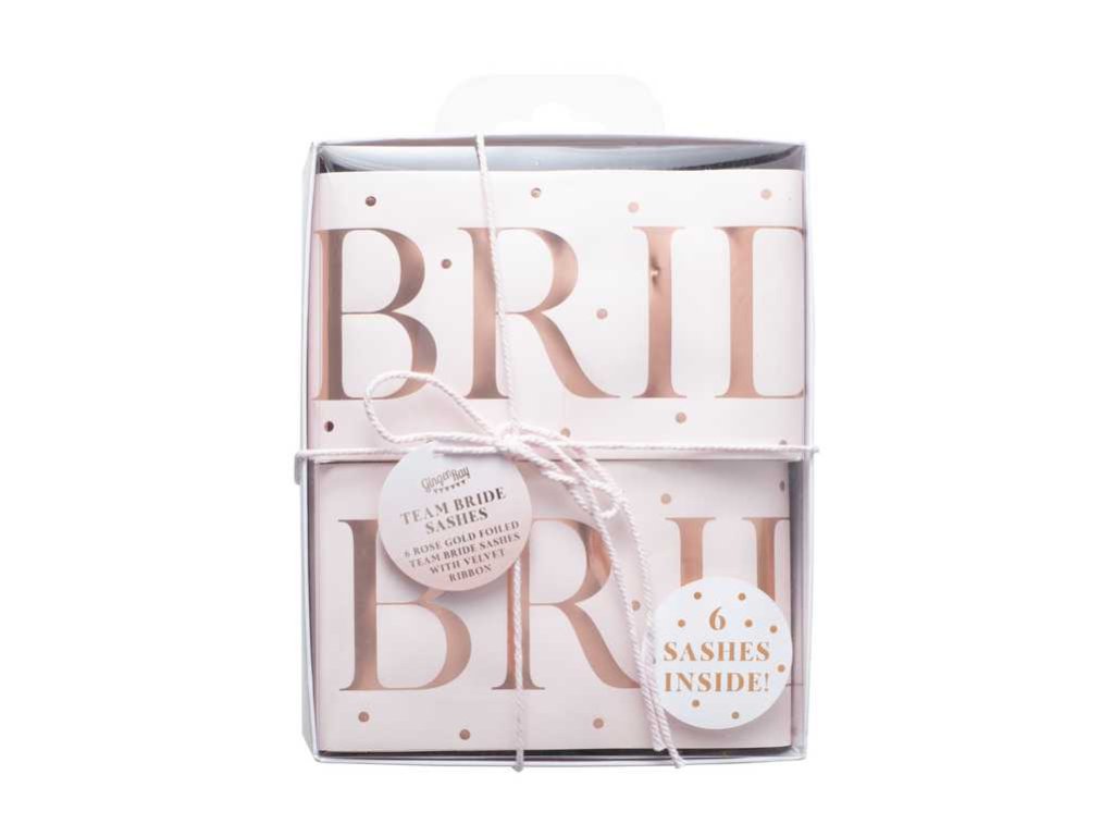Upewnij się, że druhny będą świętować z Tobą wieczór panieński w naprawdę świetny sposób. Podaruj im te piękne szarfy w kolorze pudrowego różu z brokatową metką Team Bride w kolorze różowego złota.