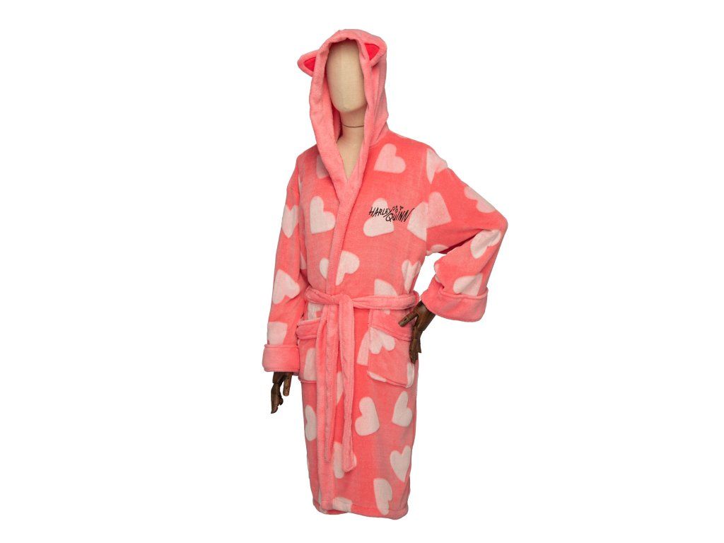 Szlafrok inspirowany Harley Quinn z filmu Birds of Prey. Przyciągający uwagę różowy kolor z romantycznymi serduszkami, przyjemny delikatny materiał i wyszywane czarne detale.