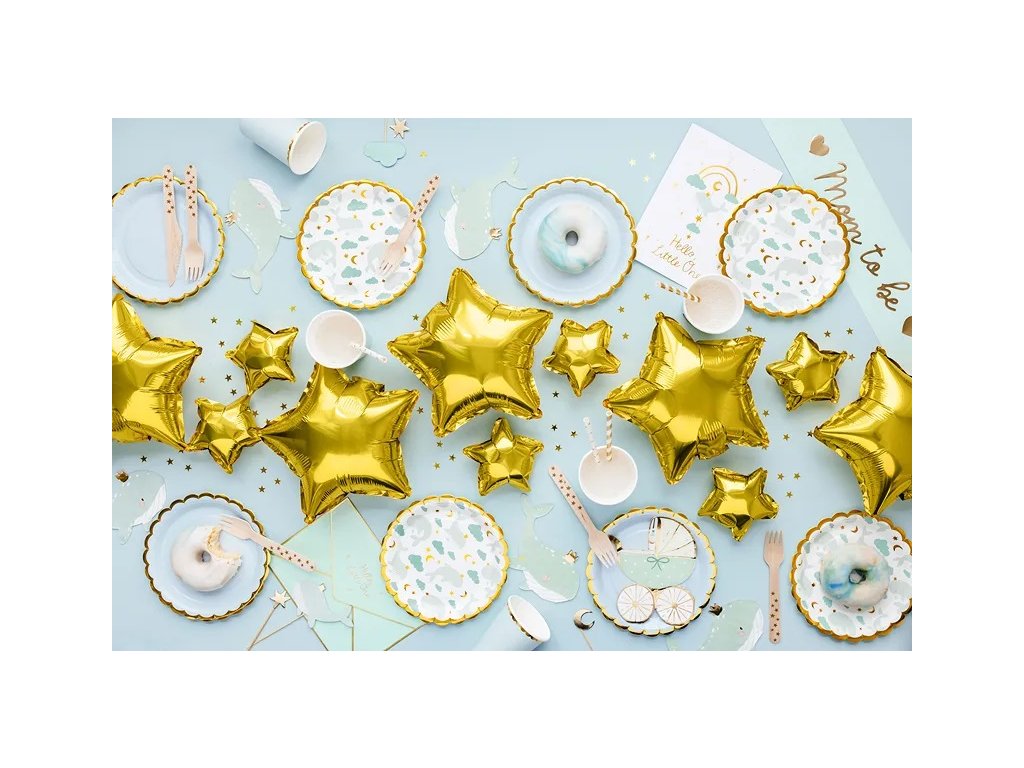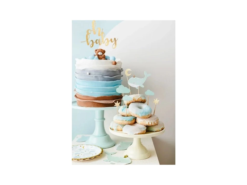 Eleganckie talerze z nadrukiem wieloryba o średnicy 18 cm to idealny wybór na przyjęcie baby shower. Nadruk wieloryba nadaje talerzom subtelny wygląd, który ożywi posiłek. Idealne do serwowania przystawek, deserów lub mniejszych porcji. Dodaj stylu swojemu przyjęciu dzięki tym talerzom.