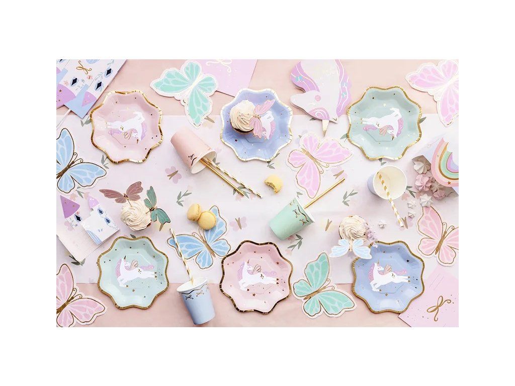 Przygotuj się na przyjęcie, na którym będzie więcej magii niż w bajce! Nasze papierowe talerze z wesołym jednorożcem są gotowe rozjaśnić każdy dziecięcy stół i zamienić zwykłą uroczystość w niezapomnianą przygodę. Wystarczy je rozłożyć, dodać mnóstwo balonów i nagle znajdziesz się w krainie, gdzie tort nigdy się nie kończy, a śmiech jest obowiązkowy! Z tymi talerzami każdy kęs będzie odrobinę bardziej magiczny – a kto wie, może jednorożec spełni też jakieś tajne życzenie. Impreza może się zaczynać, jednorożec już tańczy!