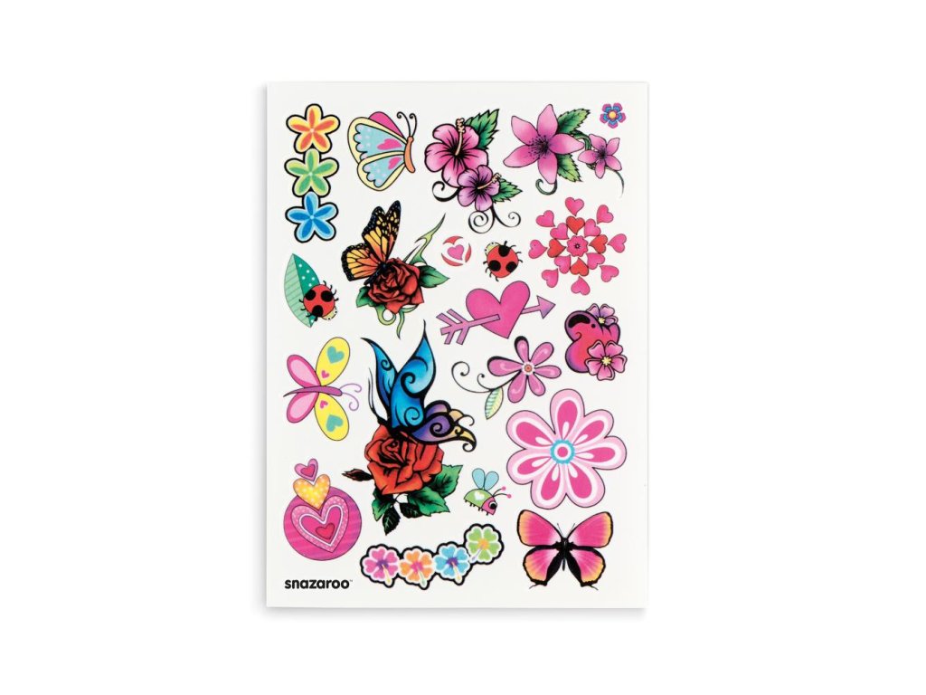 Uzupełnij wzór malowania twarzy swojego dziecka o tatuaże na ciało! Wybierz spośród 20 wzorów z wróżkami, motylami i kwiatami, wszystkie błyszczące kolorami.