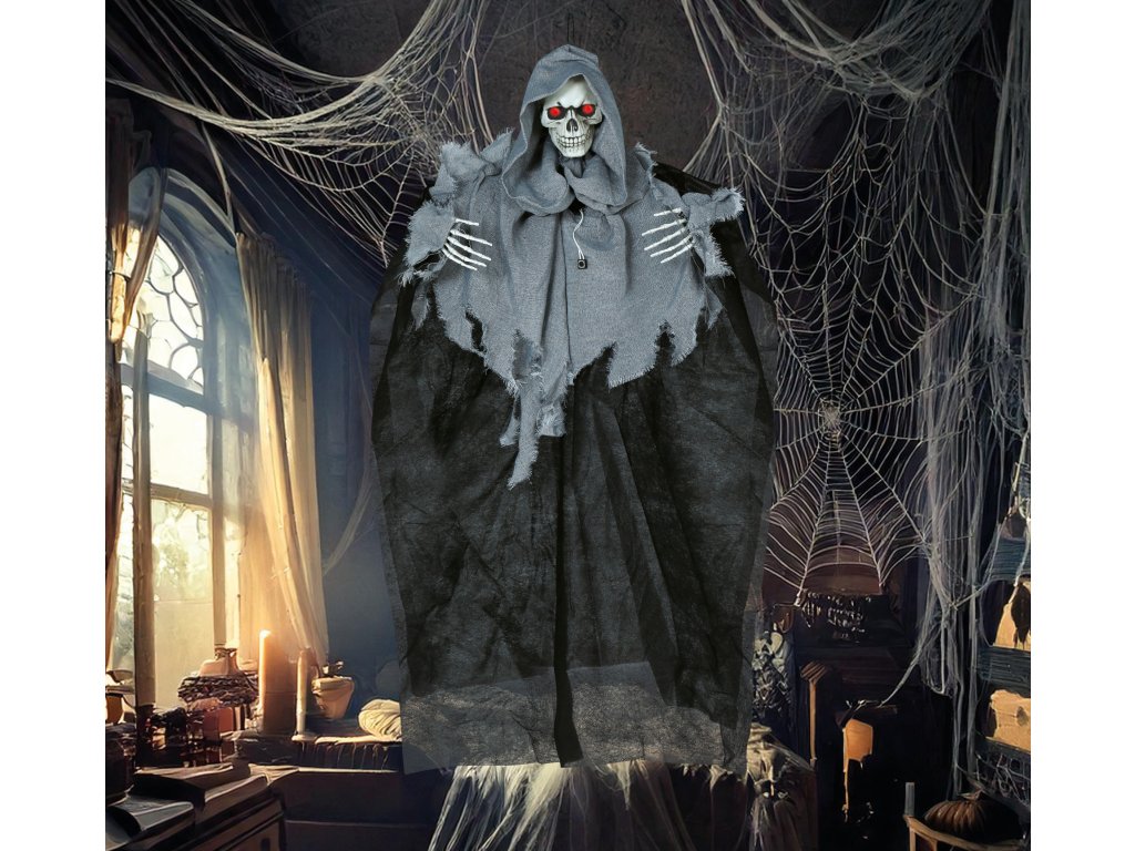 Straszny wiszący szkielet to idealny dodatek na Halloween lub przyjęcie tematyczne. Po aktywacji szkielet porusza się, wydaje przerażające dźwięki, a jego oczy świecą, tworząc idealnie horrorową atmosferę. Dzięki rozmiarowi 90 cm wygląda realistycznie i na pewno przestraszy każdego gościa. Doskonała dekoracja do zawieszenia do wnętrz lub na drzwi.