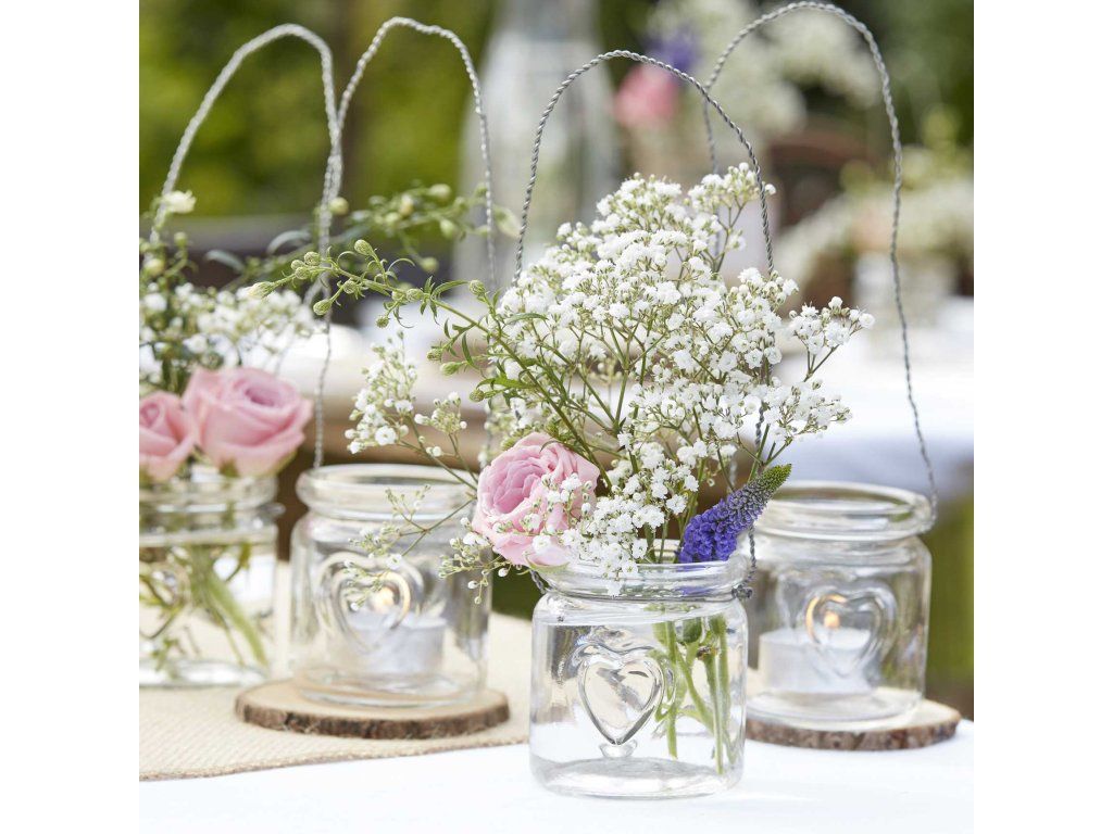 Wiszące szklane świeczniki stworzą romantyczną atmosferę, gdy dzień zamienia się w noc, a świece świecą podczas Twojej uroczystości. Szklane świeczniki na świeczki herbaciane mają zdobiony w szkle kształt serca - metalowy drut pozwala zawiesić świecę herbacianą na gałązkach, gwoździach i haczykach.