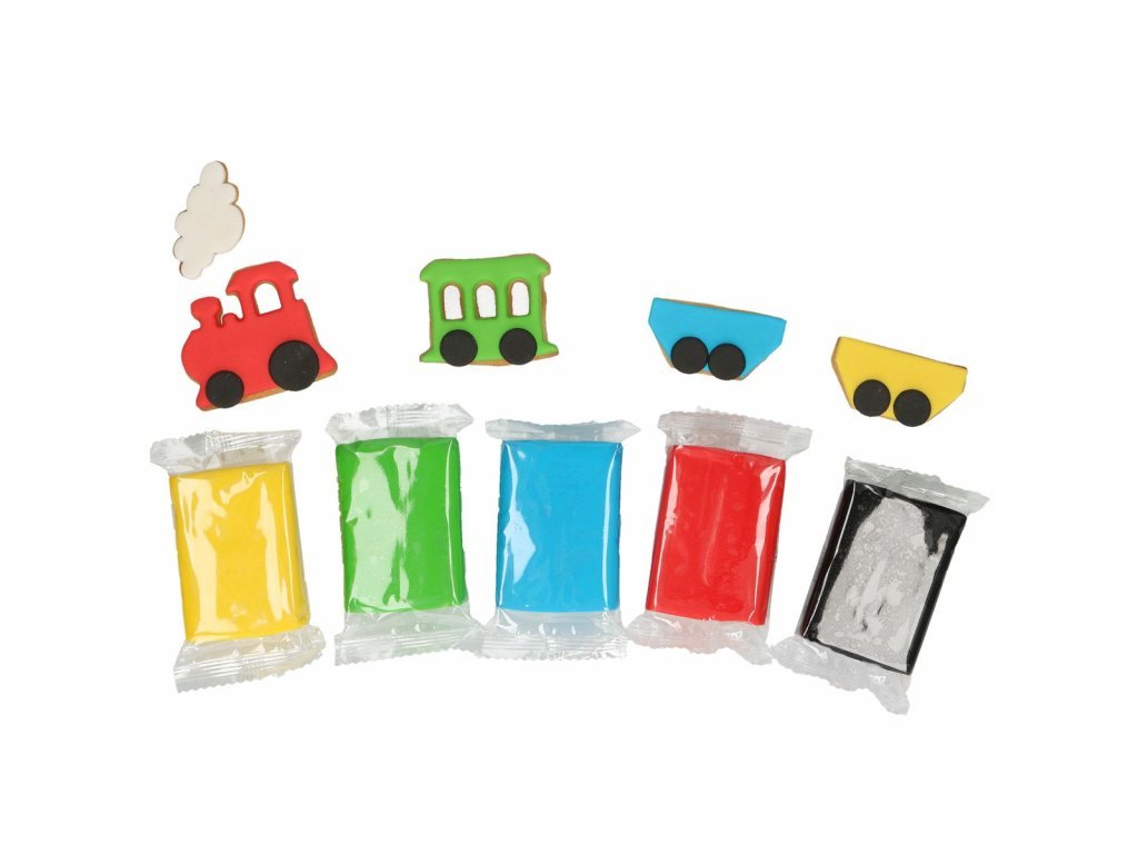 Zestaw podstawowych kolorowych mas do powlekania i modelowania składający się z masy cukrowej w kolorze: czarnym, czerwonym, żółtym, zielonym i niebieskim. Ich struktura sprawia, że idealnie sprawdzają się do powlekania tortów i ciast, ale także do modelowania różnych kształów i dekoracji, figurek, listków, płatków, kwiatków, a przy tym do ozdabiania cake pops, muffinek i cupcakes. Jest odpowiedni dla każdego początkującego i profesjonalnego cukiernika.